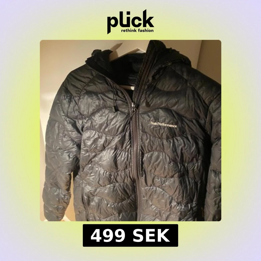 Svart dunjacka från Peak Performance med vågformat quiltat mönster. Jackan har huva, hel dragkedja framtill och diskret logga på bröstet. Perfekt för kyliga dagar och riktigt skön passform.