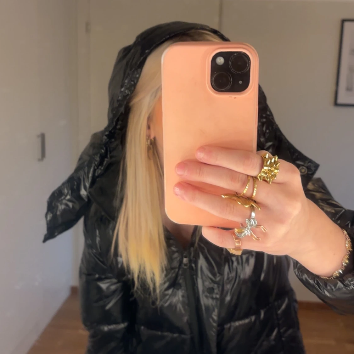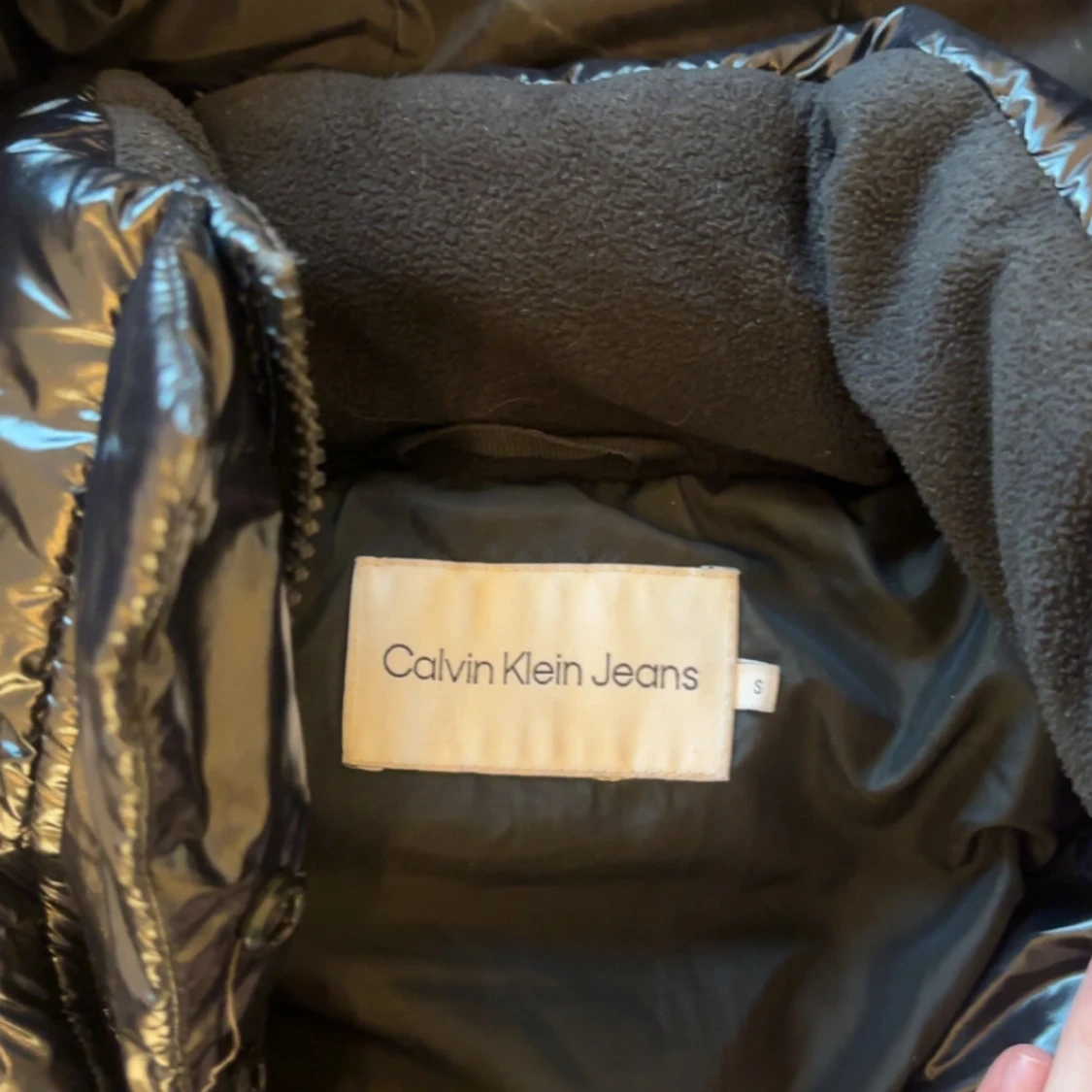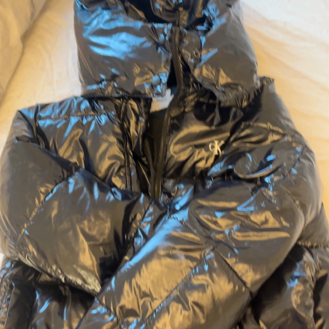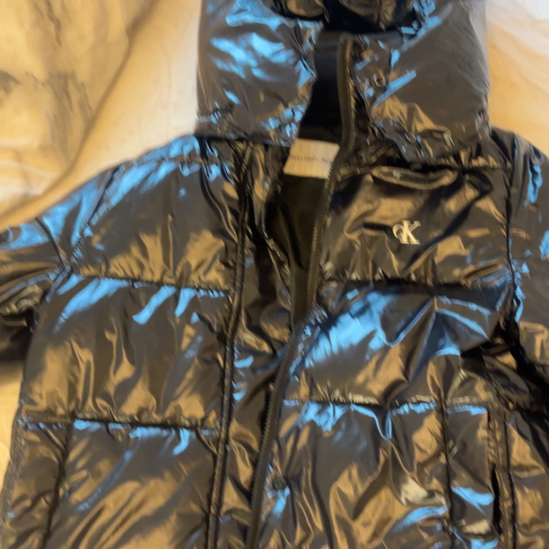 Säljer en svart, glansig pufferjacka från Calvin Klein Jeans med huva och dragkedja. Jackan har quiltad design och CK-logga på bröstet. Perfekt för kalla dagar och har en riktigt snygg stil.💘