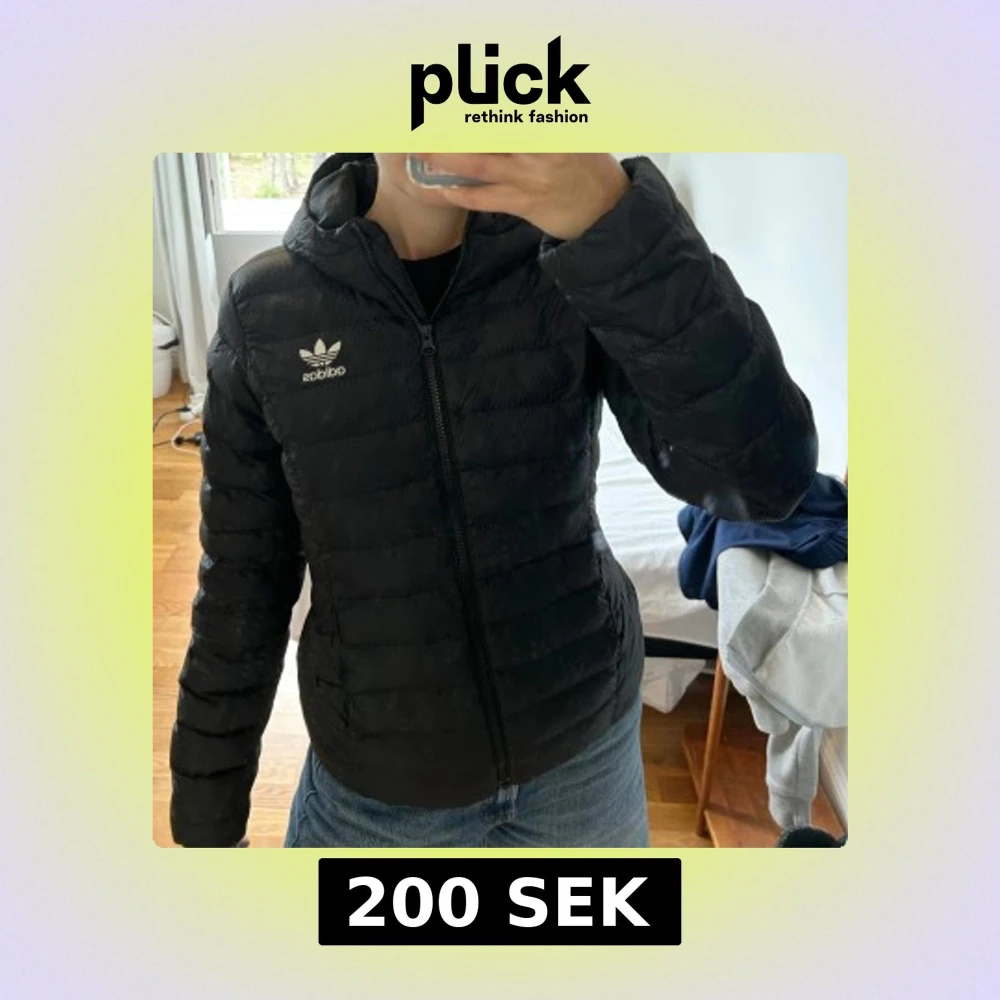 Svart pufferjacka från Adidas med huva och dragkedja framtill. Jackan har Adidas logga på bröstet och är quiltad för extra värme. Tillverkad i syntetmaterial och har en clean, sportig look som funkar till jeans eller träningsbyxor.