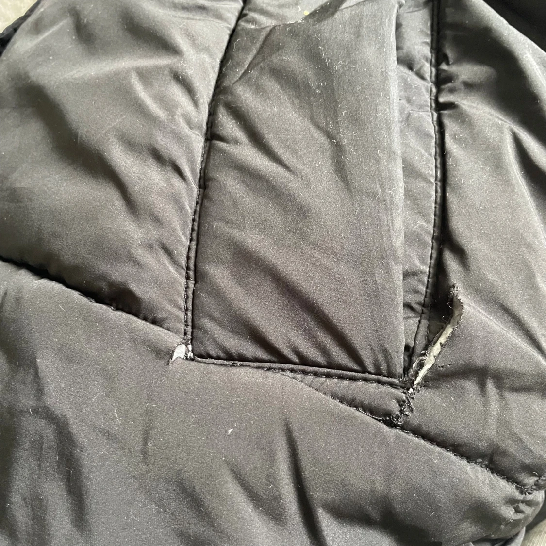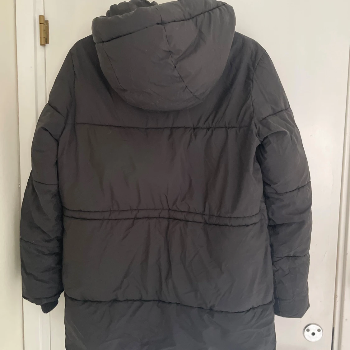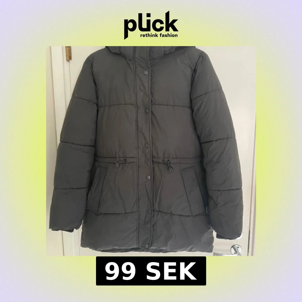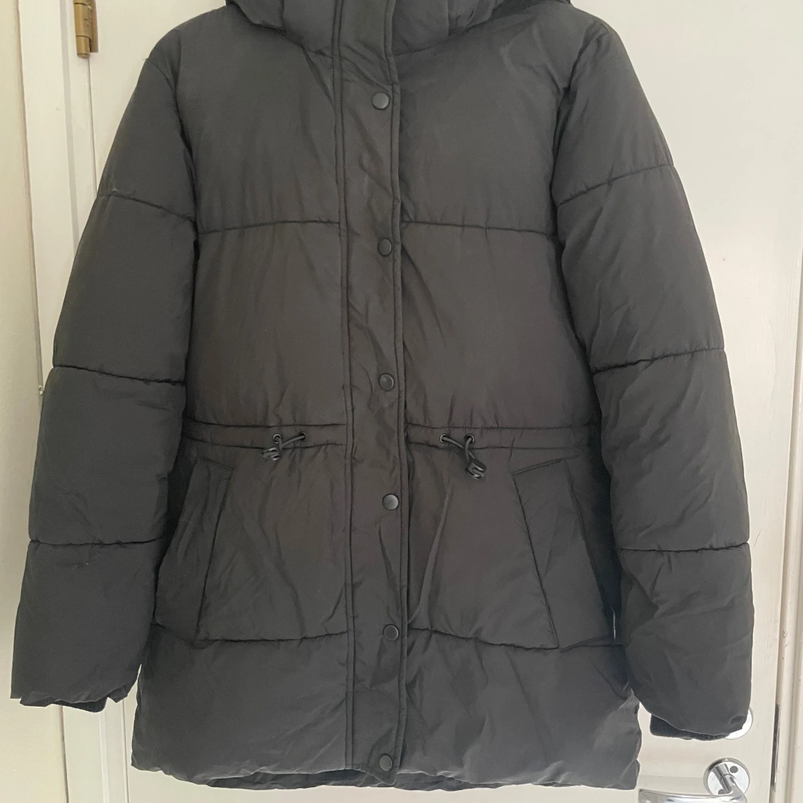 Svart pufferjacka från Amisu med huva, stora fickor och snörning i midjan. Jackan har quiltad design och stängs med både dragkedja och knappar. Perfekt för kalla dagar och har en loose passform som ger skön streetkänsla. Sitter som S. Har ett litet hål (se bild 4) men de syns knappt