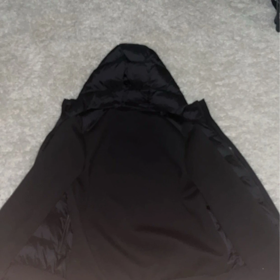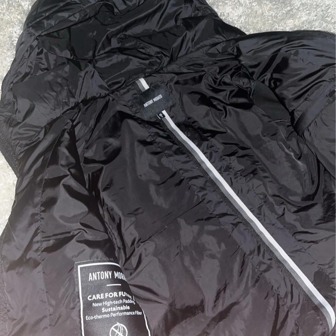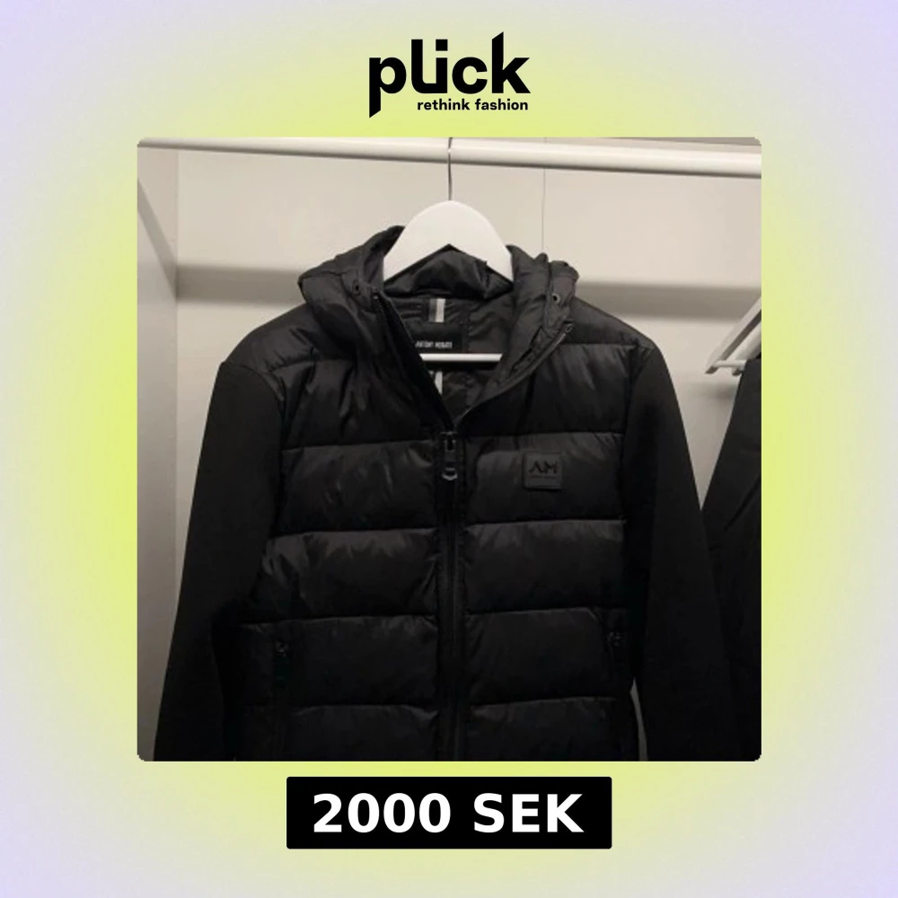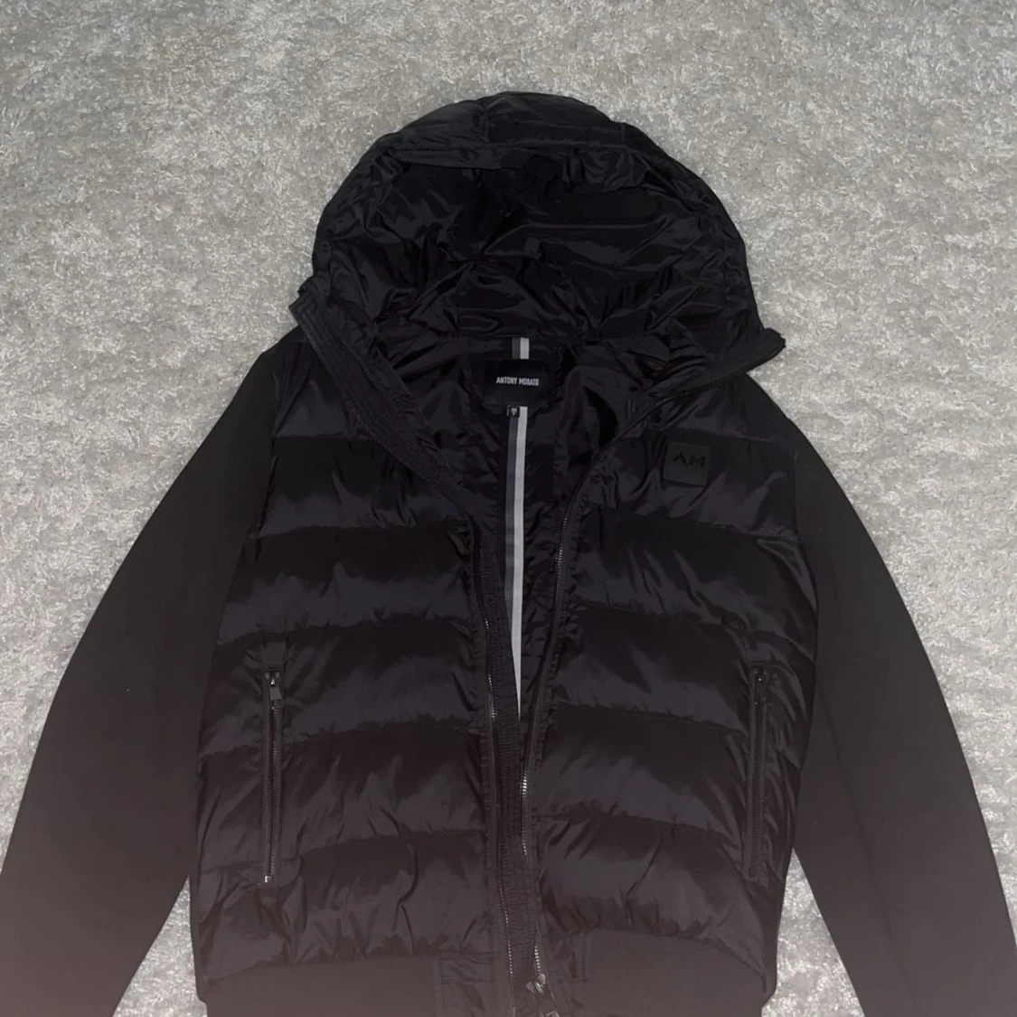 Snygg svart pufferjacka från Antony Morato med huva och dragkedja. Jackan har en quiltad design och är perfekt för kyligare dagar. Den har långa ärmar och en stilren look.