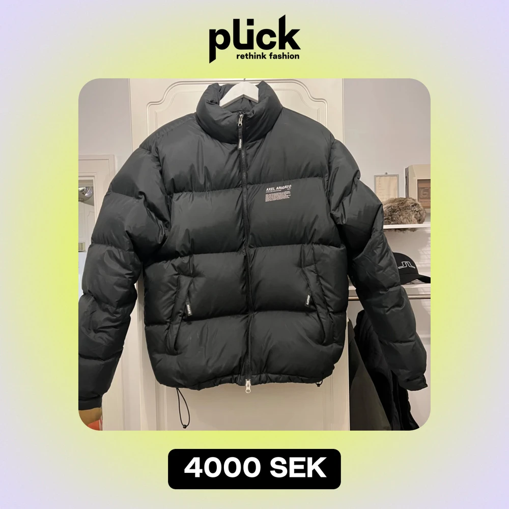 Säljer en snygg svart pufferjacka från Axel Arigato. Jackan har en dragkedja framtill och två fickor med dragkedjor. Perfekt för kalla dagar med sin tjocka vaddering. Den har en stilren design med märkets logga på bröstet. Passar både till vardags och mer uppklädda tillfällen.