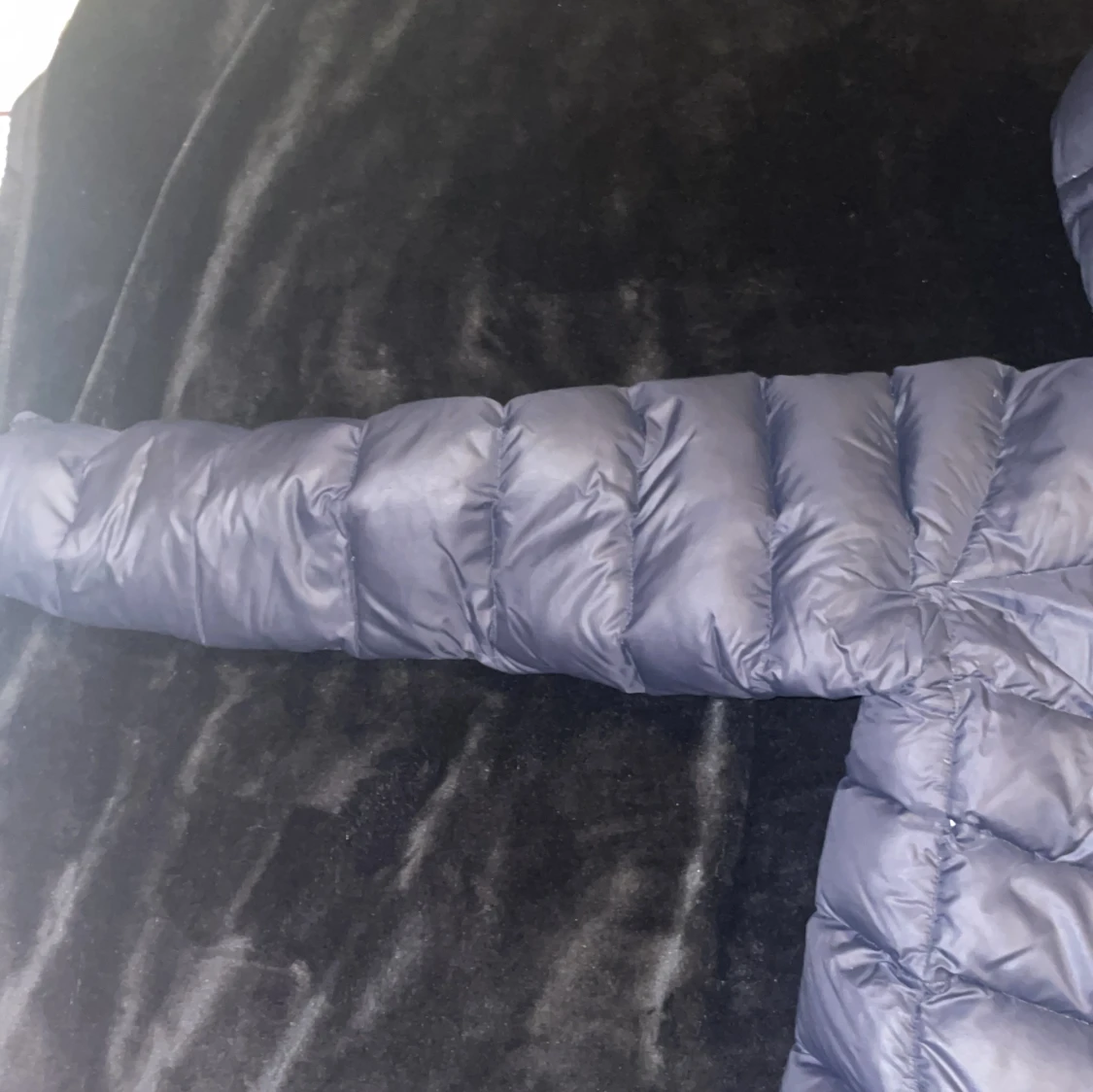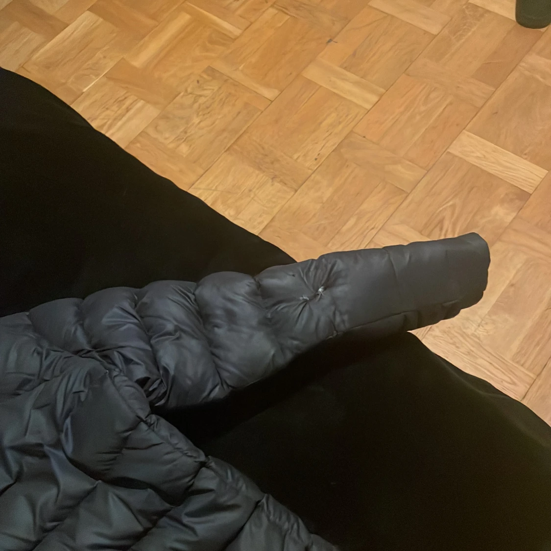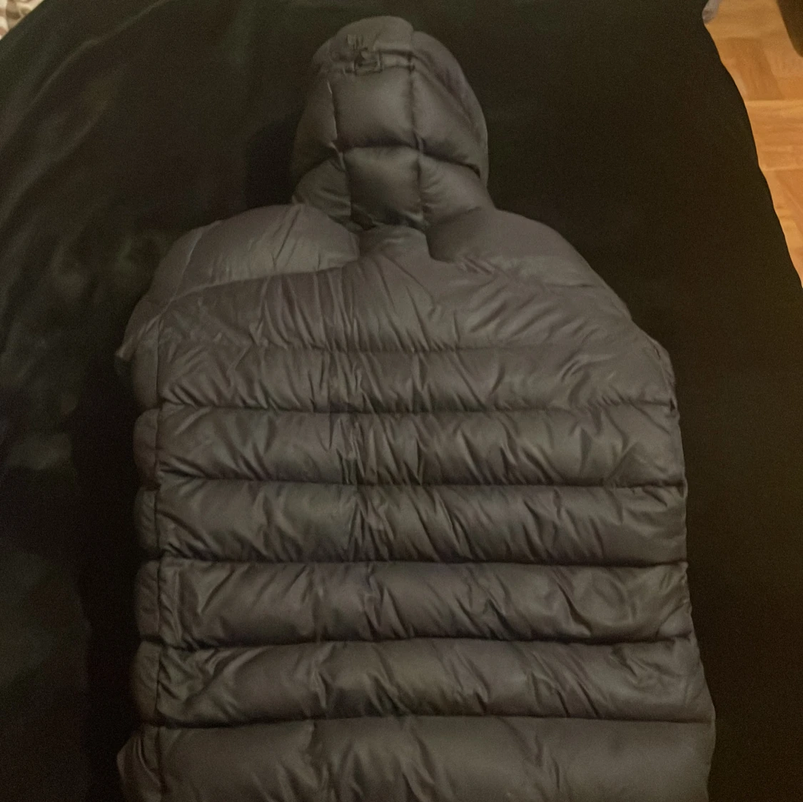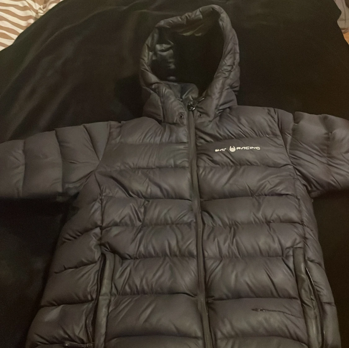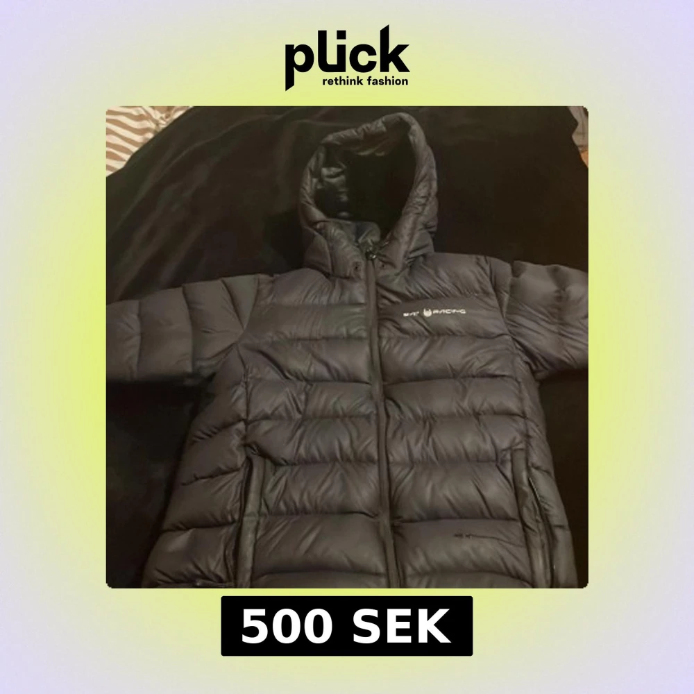 Säljer en svart pufferjacka från BAT RACING med huva och dragkedja framtill. Jackan är vadderad och har en quiltad look med breda kanaler. Perfekt för kalla dagar och har en clean, sportig vibe.