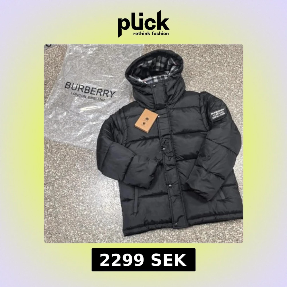 Svart pufferjacka från Burberry med huva och klassiskt rutigt foder i grått, vitt och rött. Jackan har tryckknappar framtill, broderad logga på ärmen och är tillverkad i glansig polyester. Perfekt för kalla dagar och riktigt snygg streetstil.