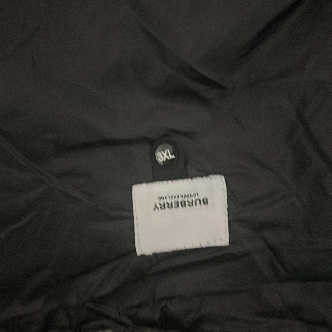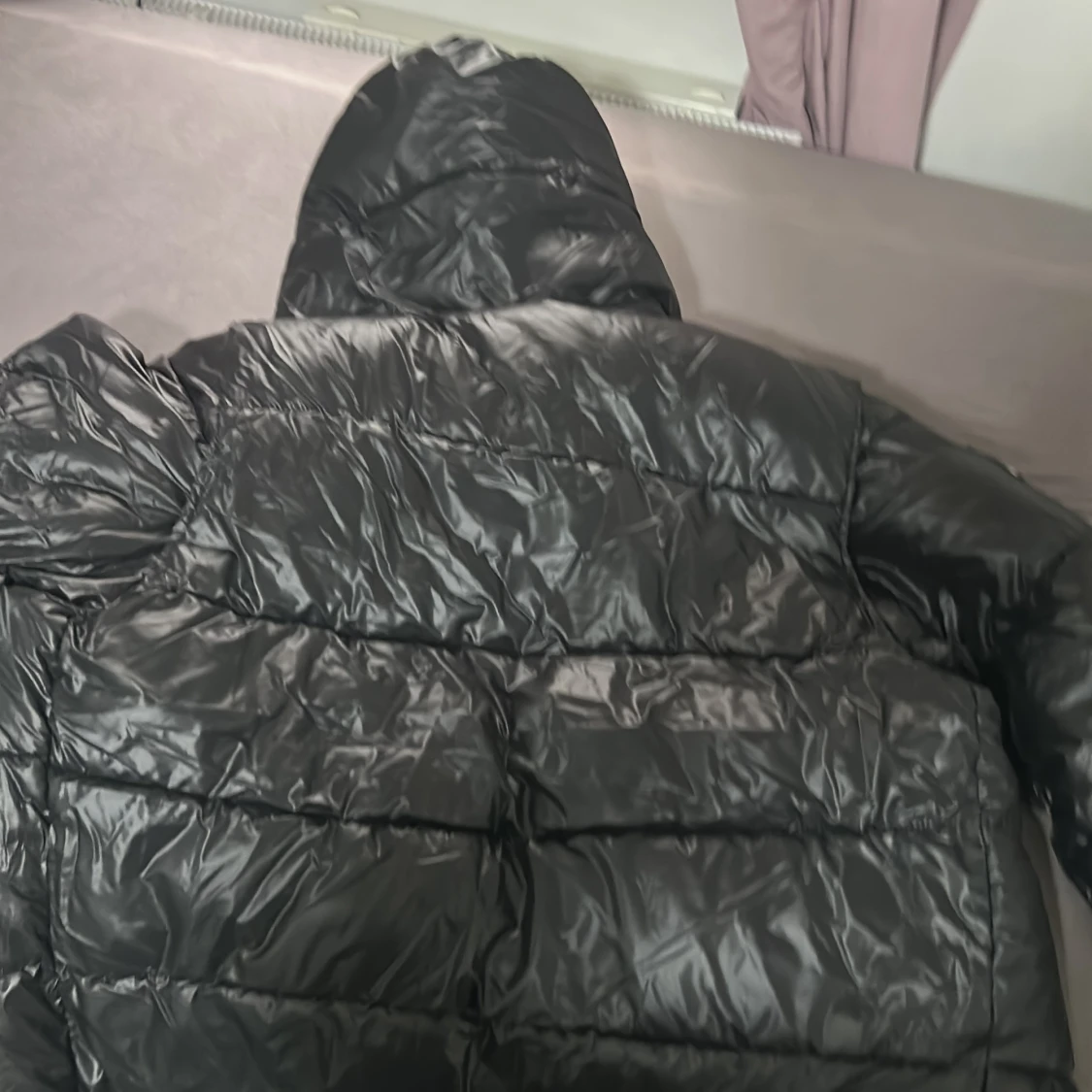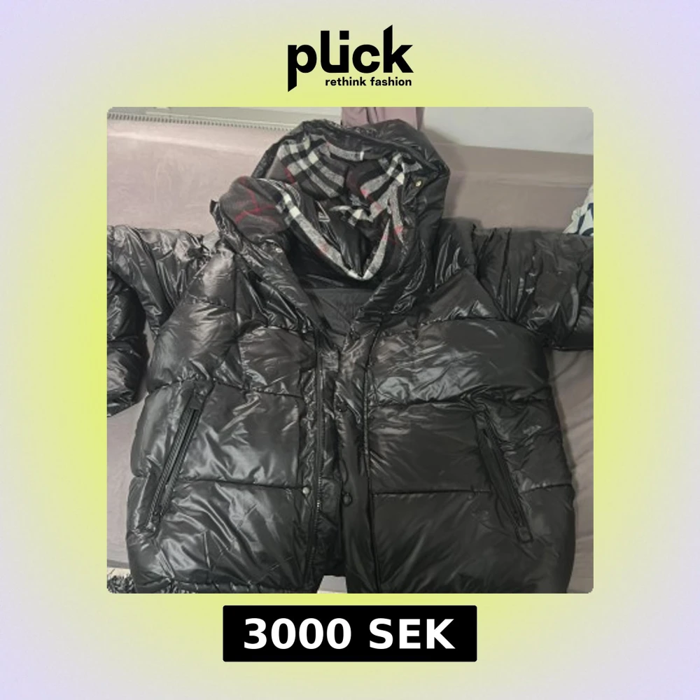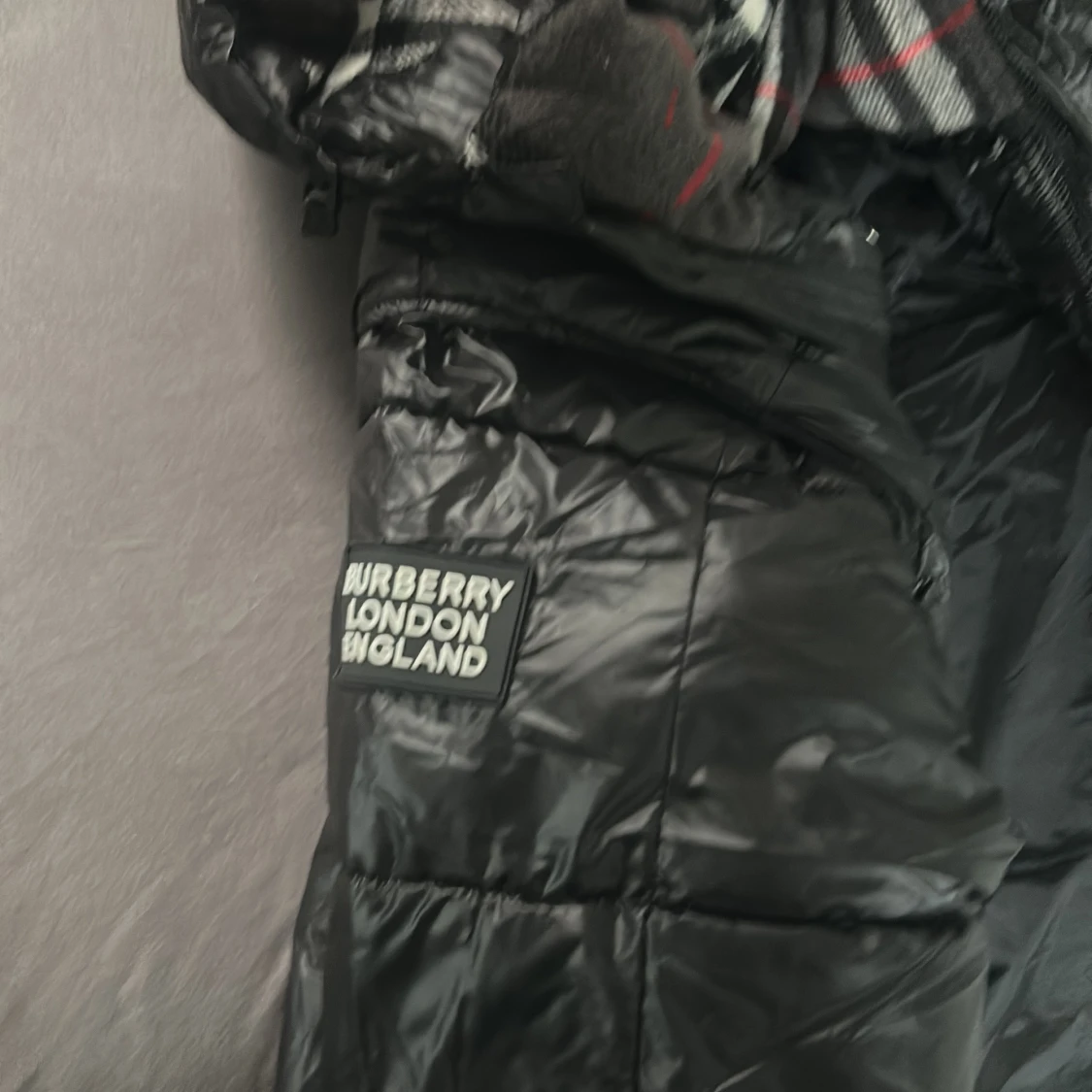 Säljer en svart pufferjacka från Burberry med glansig finish, huva och klassiskt rutigt foder. Jackan har dragkedja framtill, stora fickor med dragkedja och en patch med Burberry London England på bröstet. Perfekt för kalla dagar och riktigt snygg streetstil.