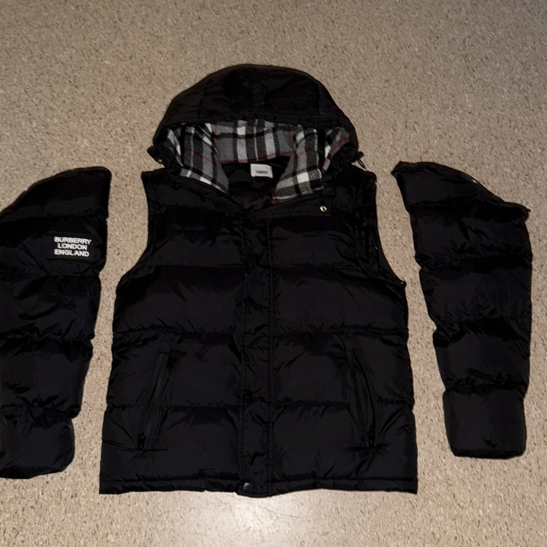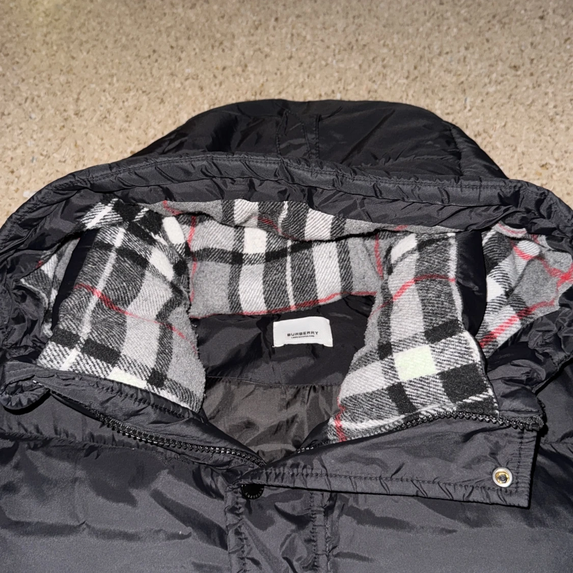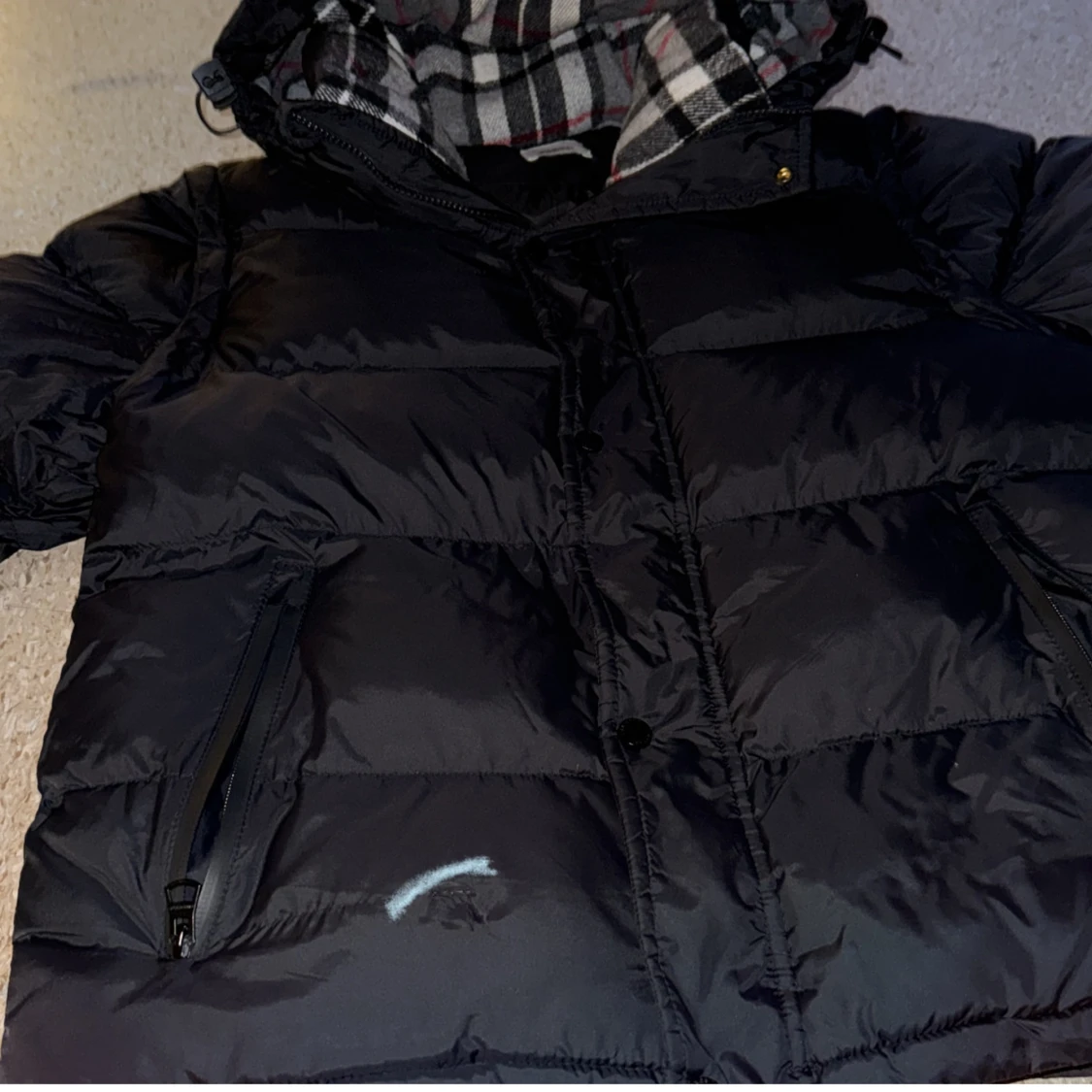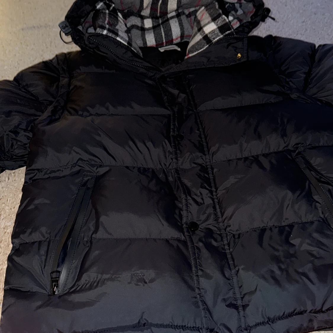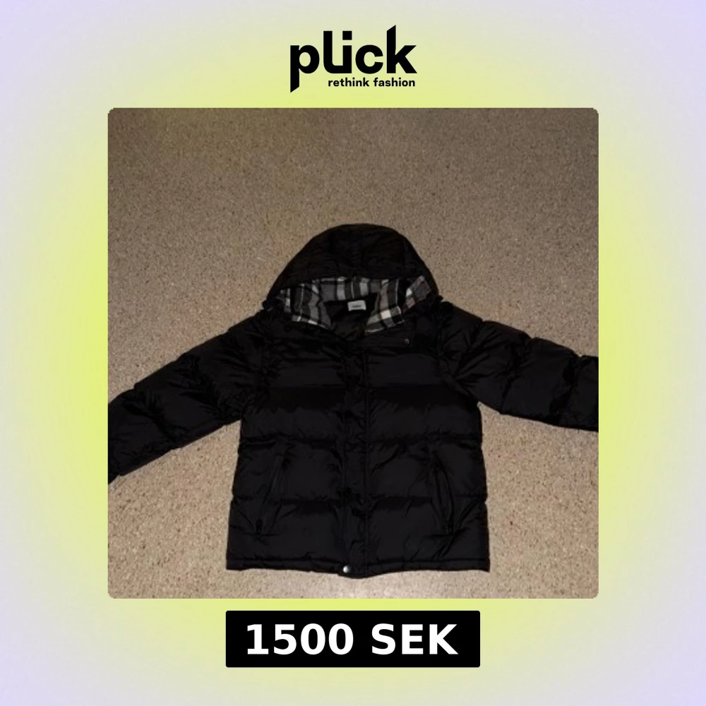 Svart pufferjacka från Burberry med klassiskt rutigt foder i huvan. Jackan har dragkedja, knappar och två fickor med dragkedja framtill. Perfekt för kalla dagar med sin vadderade design och snygga detaljer.!!!Jackan är i mycket bra skick och ren. Det finns en liten reva (som syns på bilden), men den märks knappt. Därför säljer jag den till ett lågt pris. I övrigt är jackan väldigt bra, varm och bekväm.!!!!!!!!