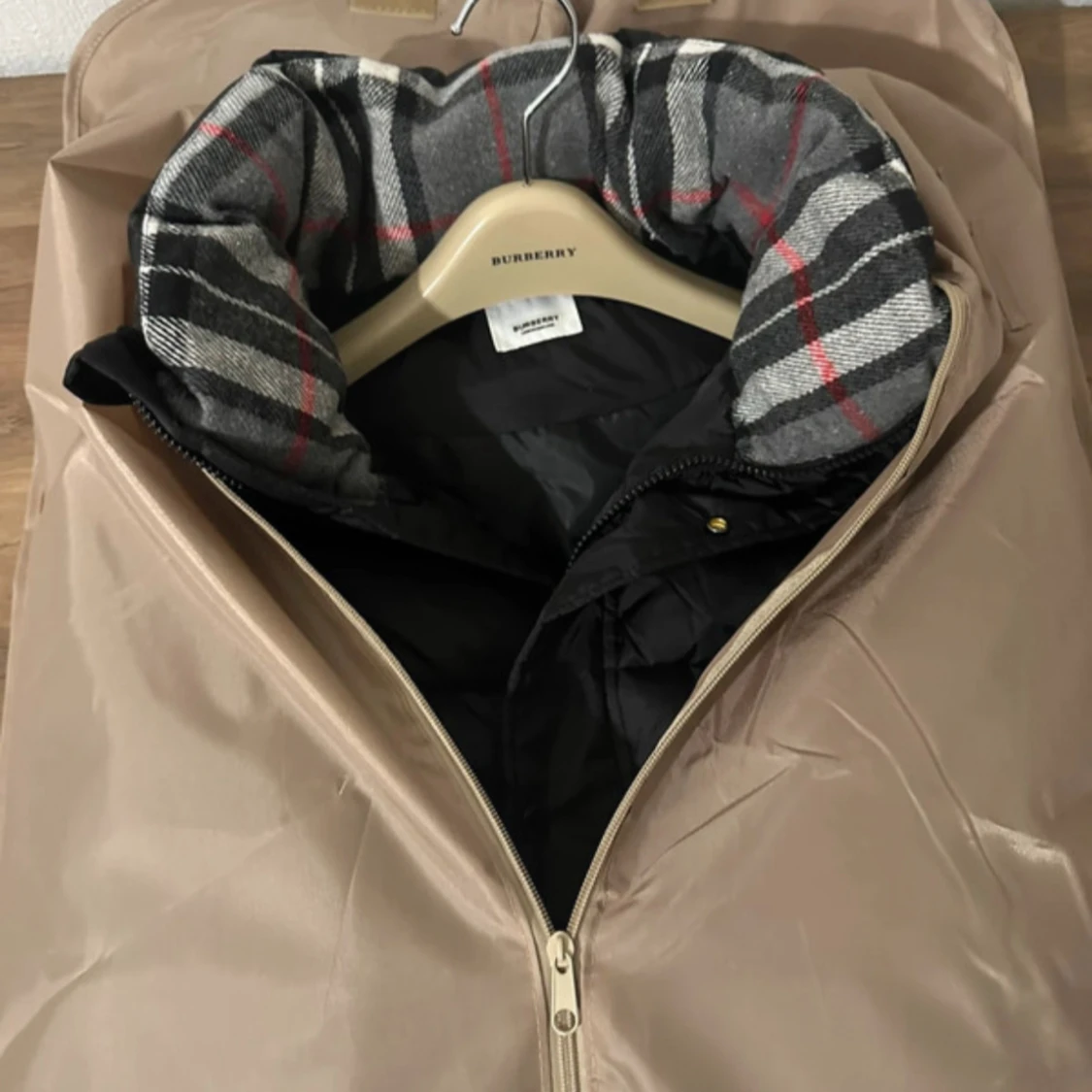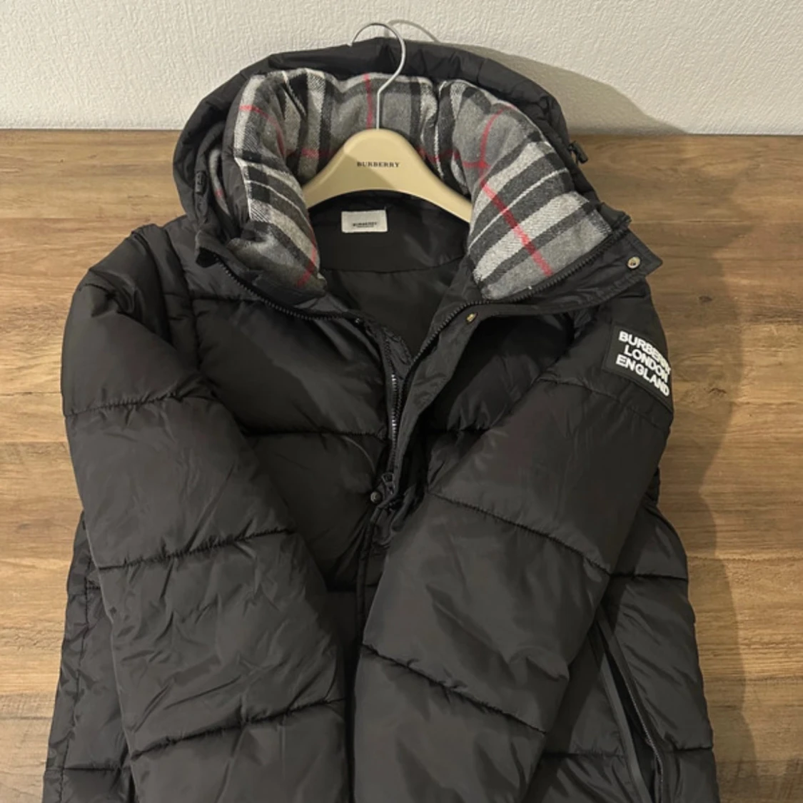 Säljer en svart pufferjacka från Burberry med klassisk rutig grå, vit och röd insida på huvan. Jackan har dragkedja framtill, huva och Burberry-logga på ärmen. Perfekt för kalla dagar och har en riktigt snygg, modern look.Storlet M men passar som S