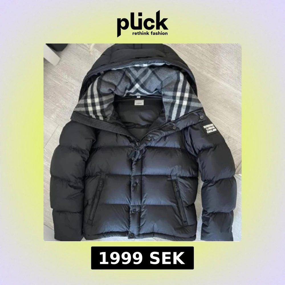 Säljer en svart pufferjacka från Burberry med klassiskt rutigt foder i huvan. Jackan har dragkedja, knappar och två fickor framtill. Perfekt för kalla dagar och riktigt snygg streetstil. Märkespatch på ärmen och oversized känsla.