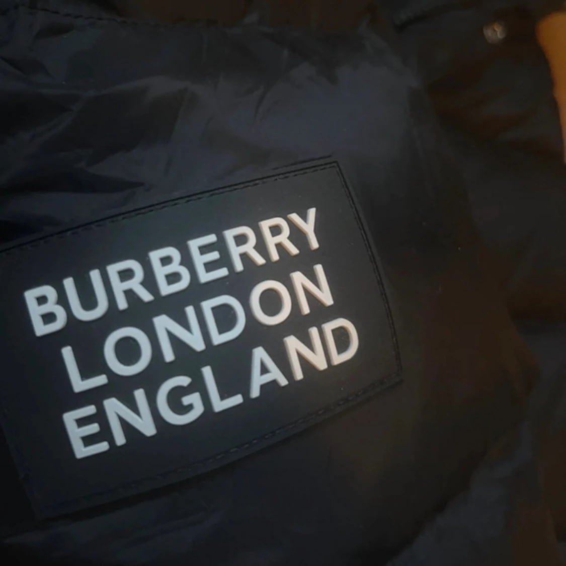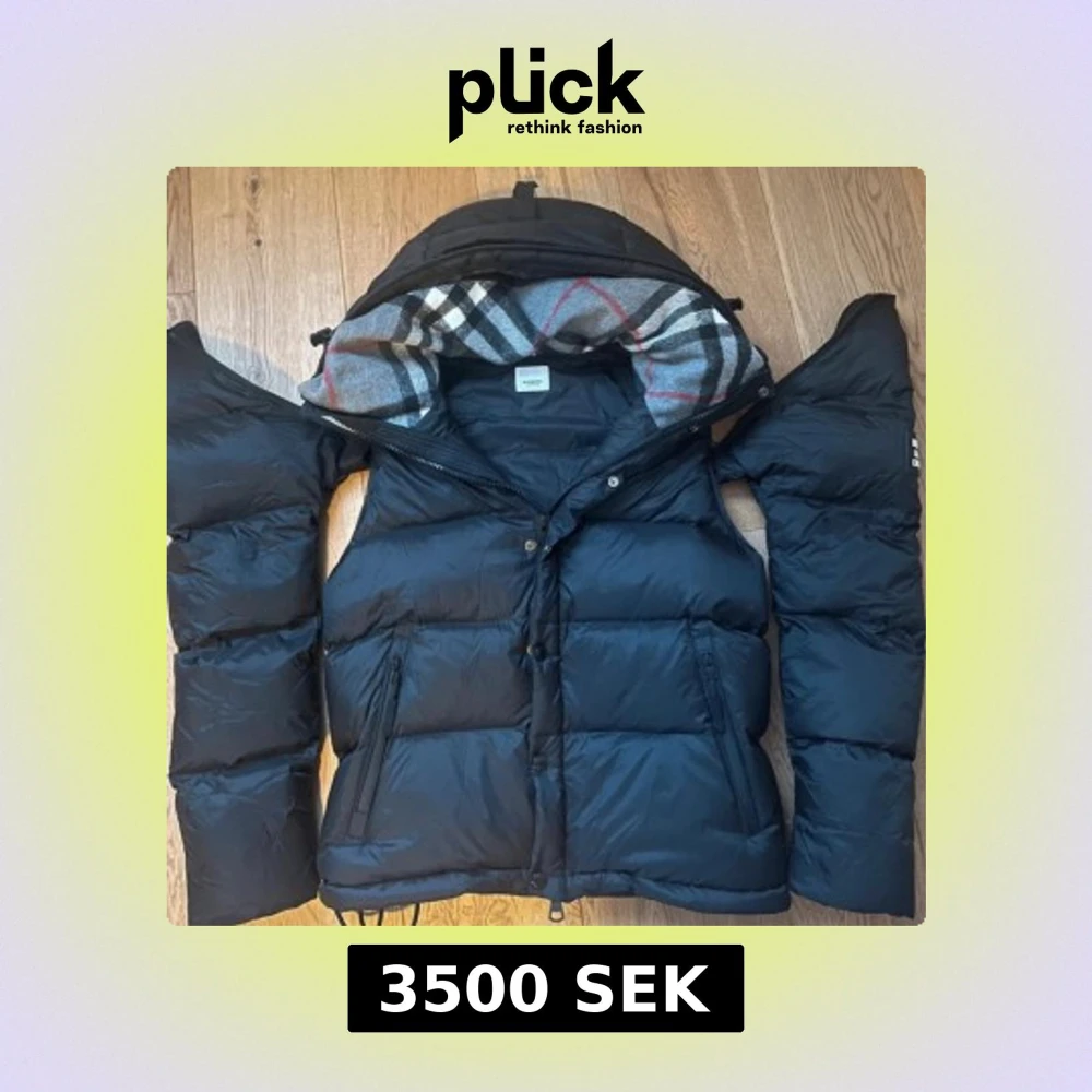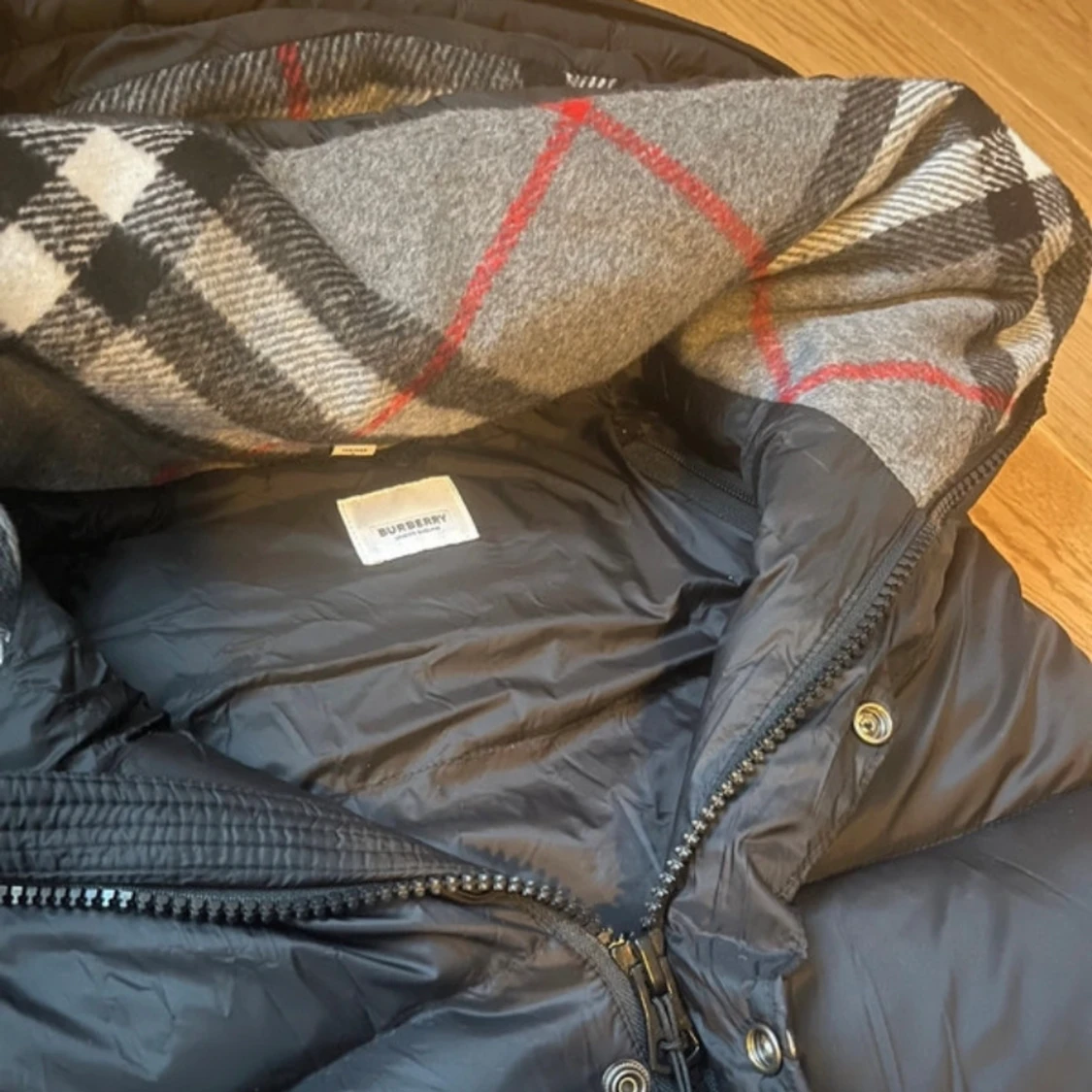 Snygg svart pufferjacka från Burberry med avtagbara ärmar och klassiskt rutigt foder i huvan. Jackan har dragkedja, knappar och två fickor framtill. Perfekt för kalla dagar och riktigt stilren med tydlig Burberry-logga på ärmen.