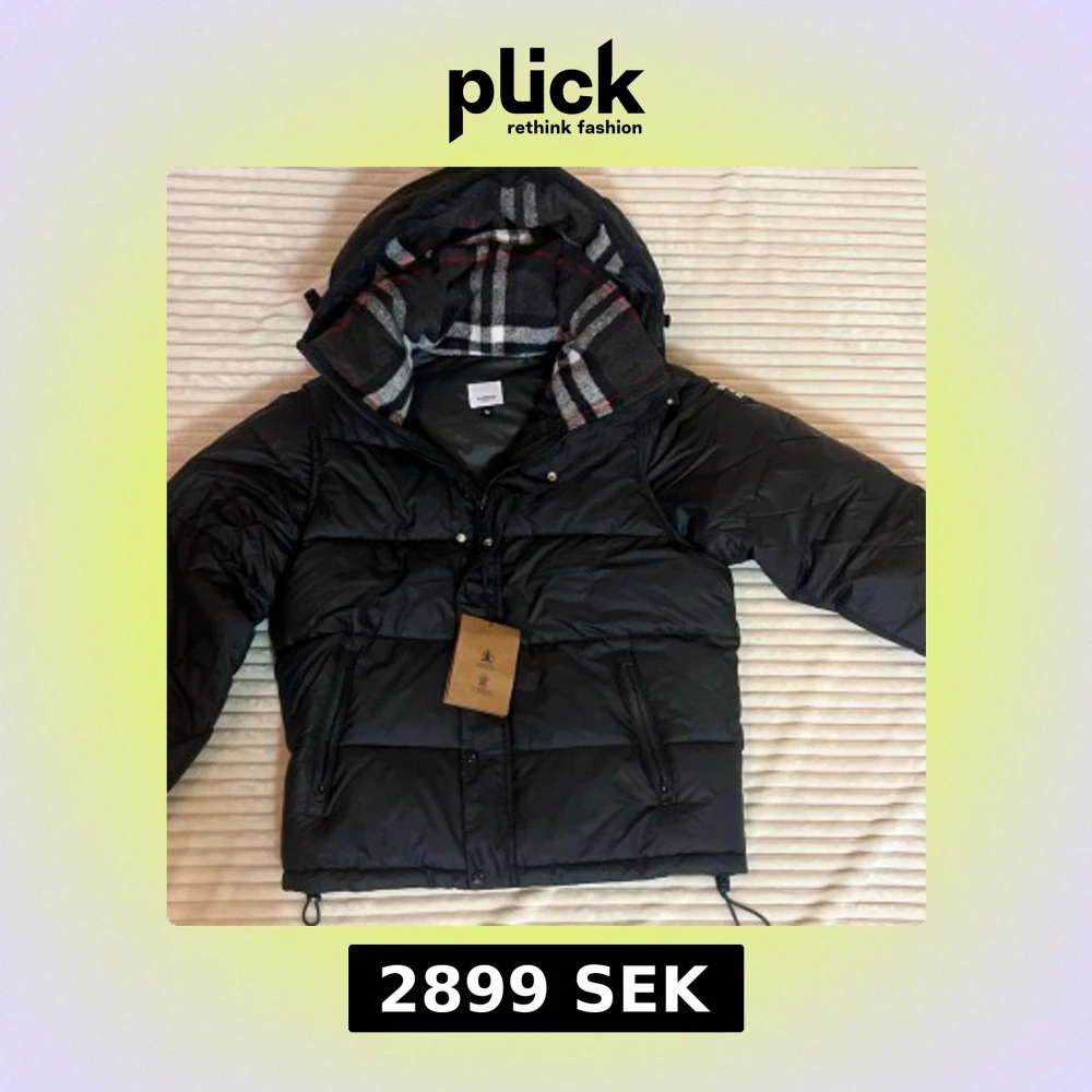 Svart pufferjacka från Burberry med avtagbara ärmar, huva och klassiskt rutigt foder. Jackan har dragkedja, knappar och två fickor med dragkedja. Materialet är bomull med detaljer i viskos och polyamid. Perfekt för kalla dagar med snygg streetkänsla.