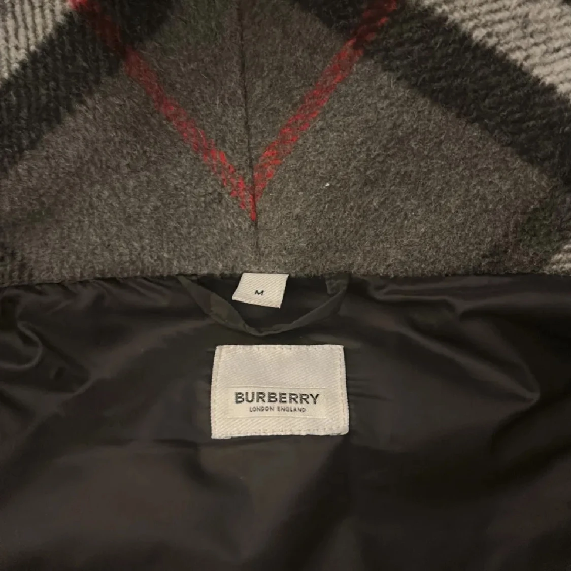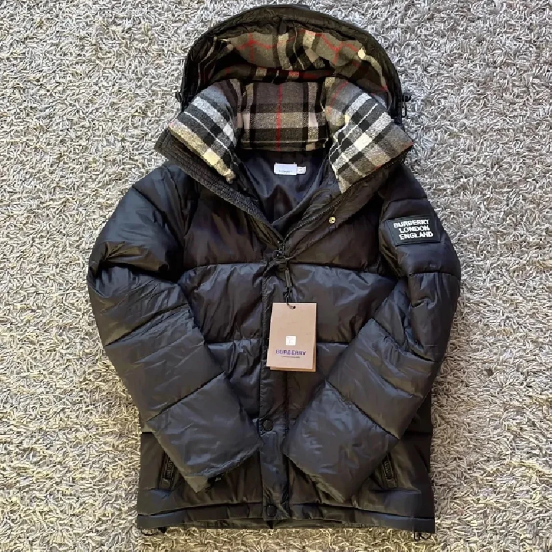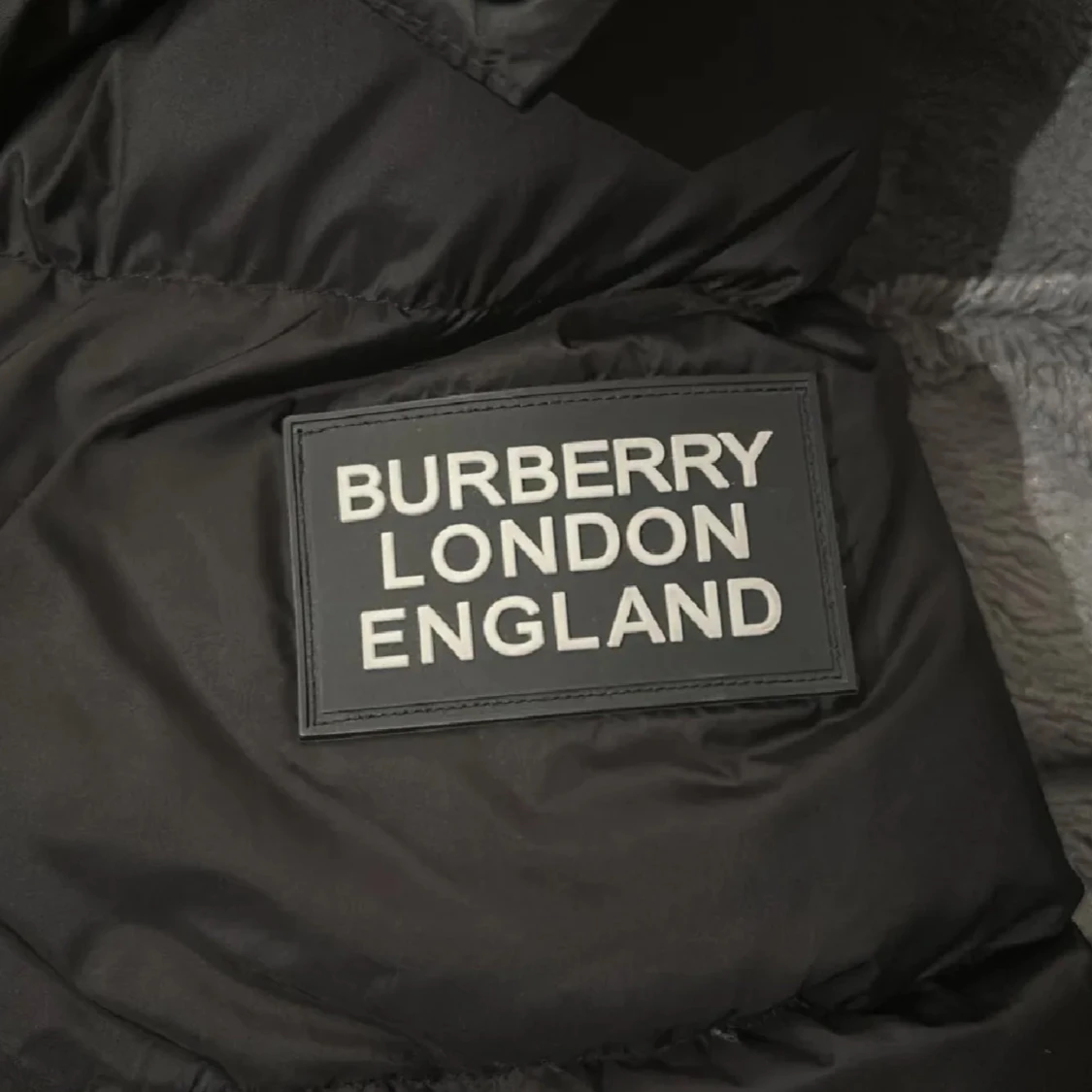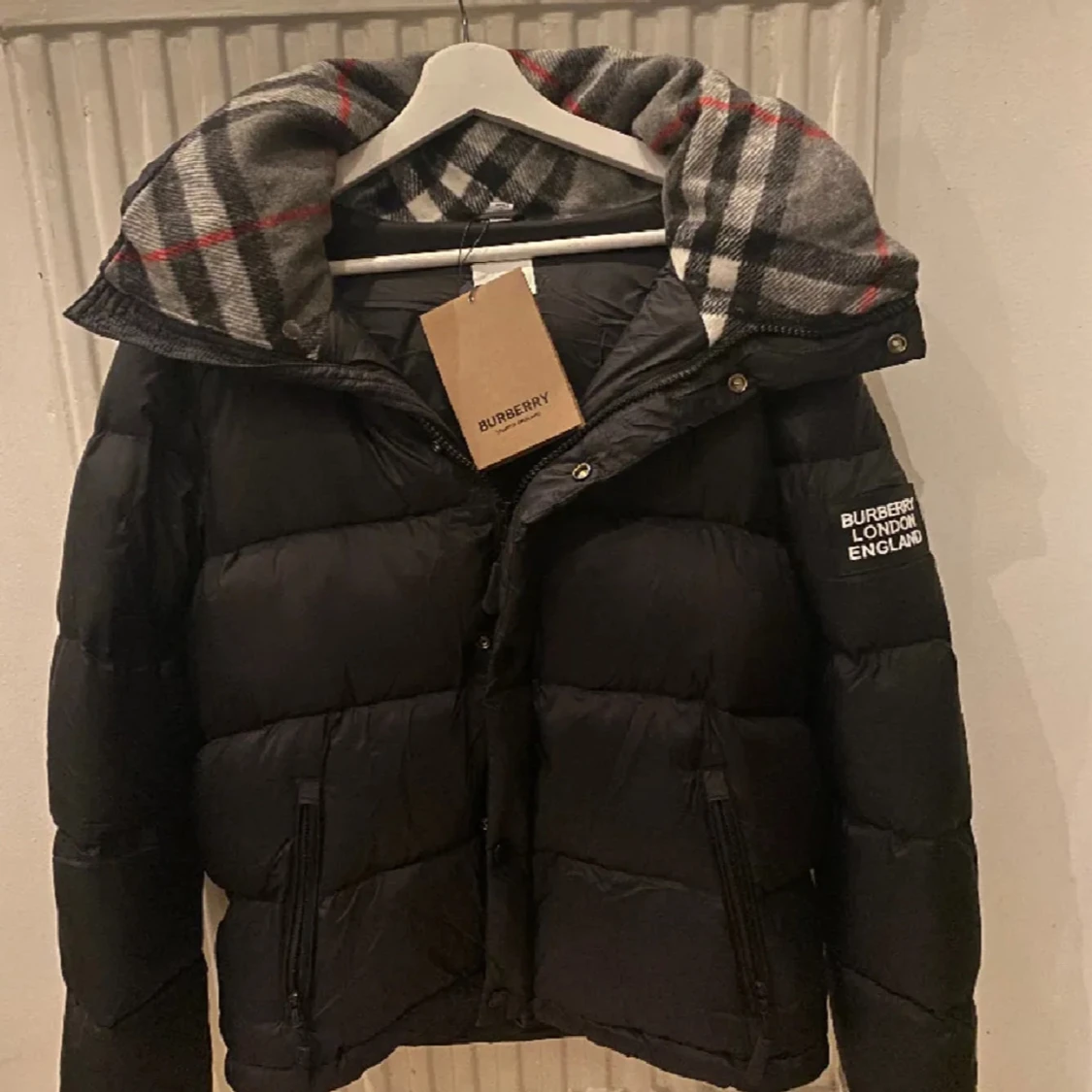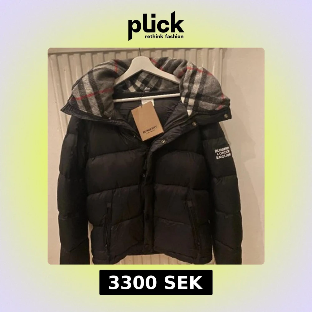 Säljer en svart pufferjacka från Burberry med klassiskt rutigt foder i huvan. Jackan har dragkedja, knappar och Burberry-logga på ärmen. Perfekt för kyliga dagar och riktigt snygg detalj med fodret.