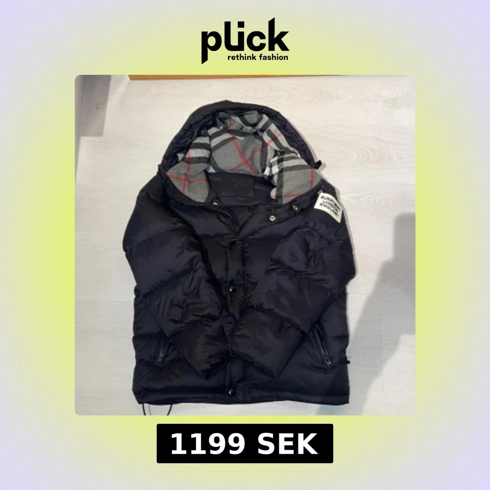 Svart pufferjacka med stor huva och rutig grå, vit och röd insida. Jackan har dragkedja, tryckknappar och två sidofickor med dragkedja. Märke 'BURRYBERY LONDON ENGLAND' på bröstet. Perfekt för kalla dagar med sin tjocka och quiltade design.
