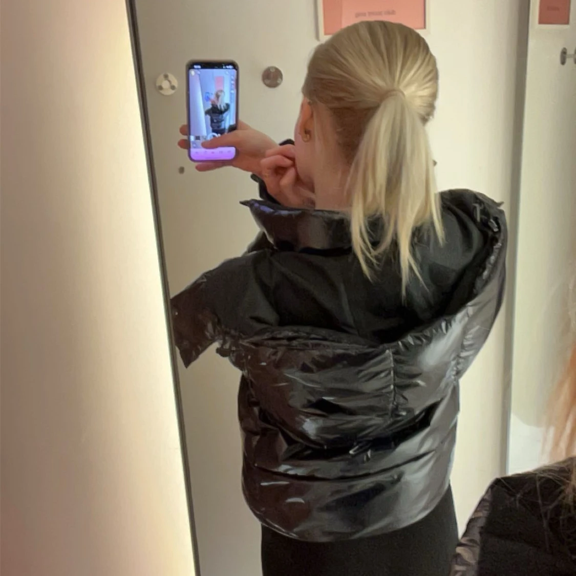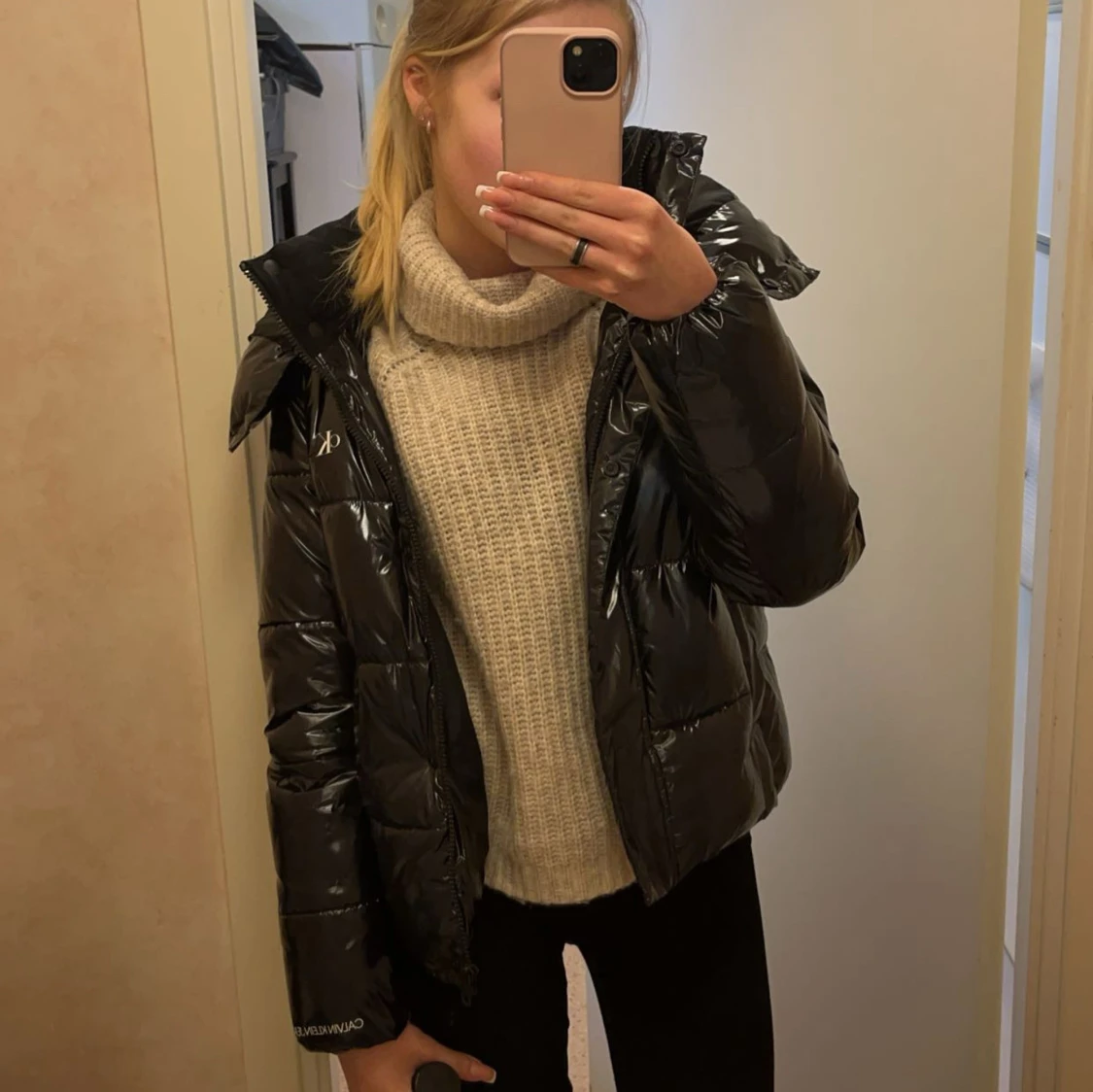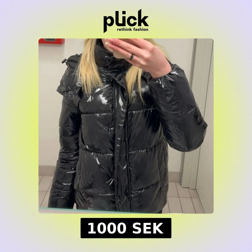 Säljer en svart, glansig pufferjacka från Calvin Klein med hög krage och dragkedja framtill. Jackan har en normal passform och är perfekt för kalla dagar. Diskret CK-logga på bröstet och ärmen. Jackan är långärmad och har en modern look💗