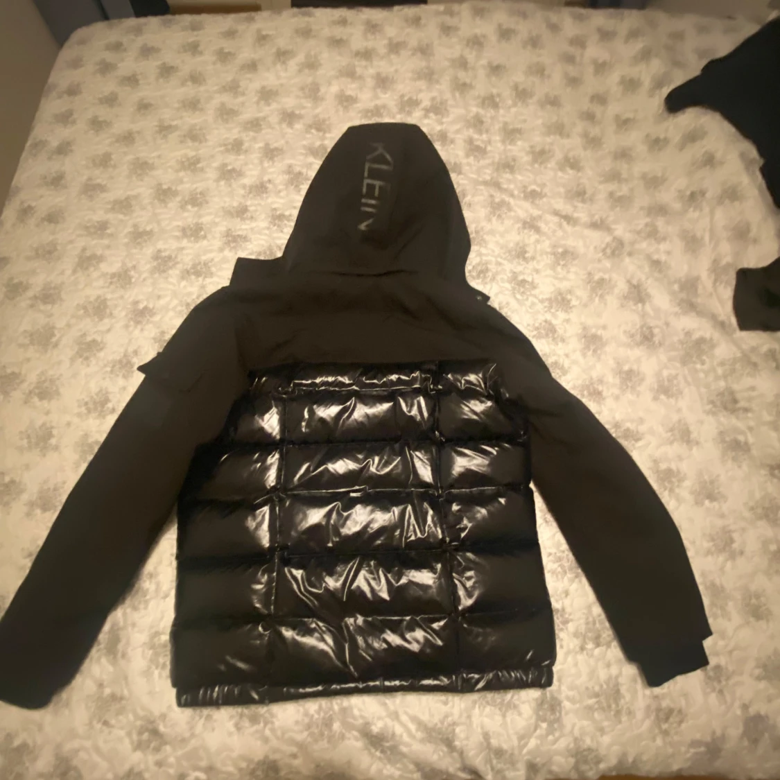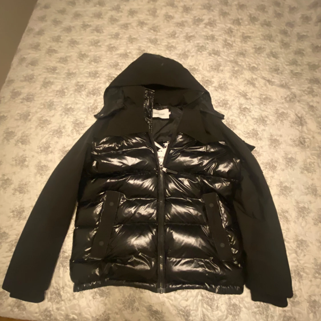 Snygg svart pufferjacka från Calvin Klein med glansig vadderad front och rygg, samt matta svarta ärmar och huva. Jackan har dragkedja, fickor med knappar och logga på huvan. Perfekt för kalla dagar och riktigt stilren look.