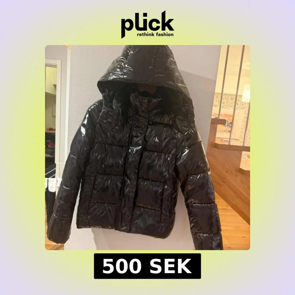 Säljer en svart, glansig pufferjacka från Calvin Klein med huva och hög krage. Jackan har quiltad design, dragkedja framtill och CK-logga på bröstet. Perfekt för kalla dagar och har en modern, oversized look.