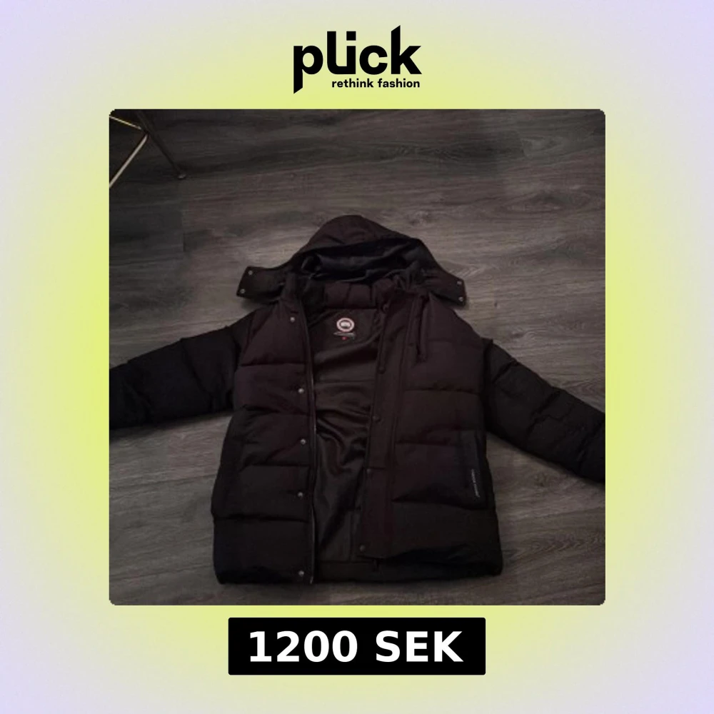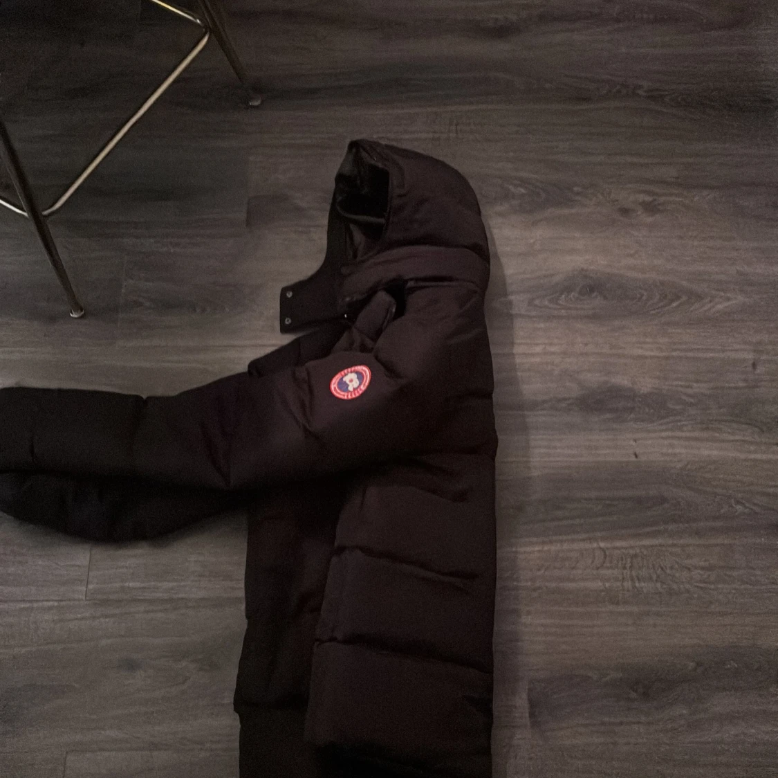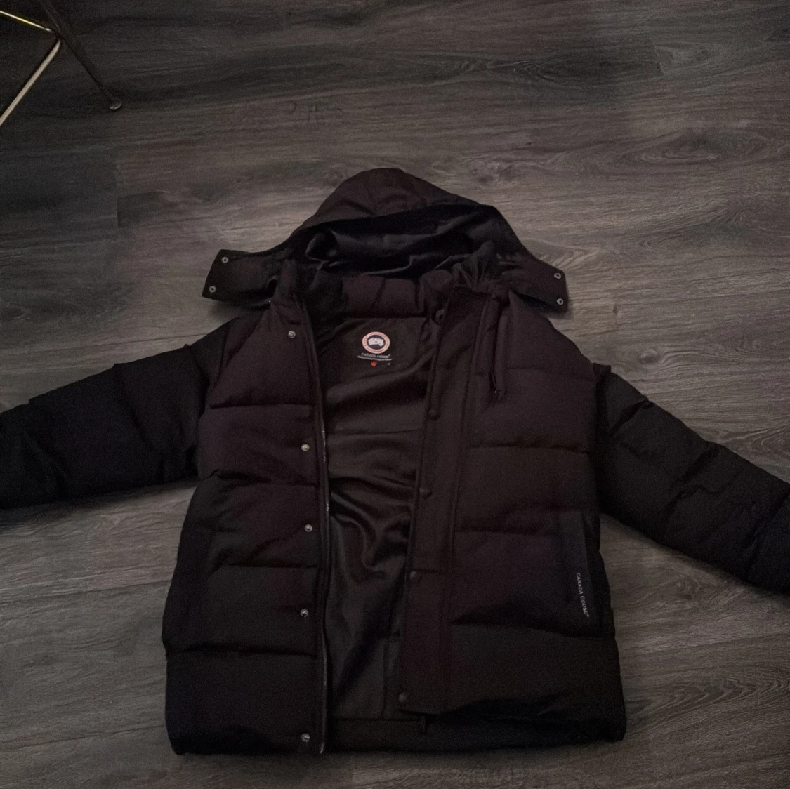 Säljer en svart pufferjacka från Canada Goose med huva och långärmad design. Jackan har en dragkedja framtill och är perfekt för kalla dagar. Den ikoniska loggan syns på ärmen. Passar bra för vinterns alla äventyr.