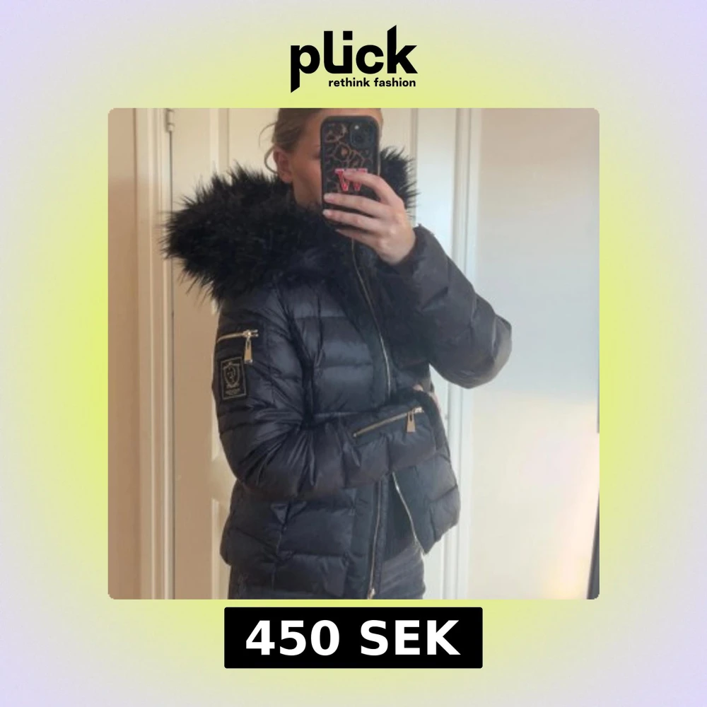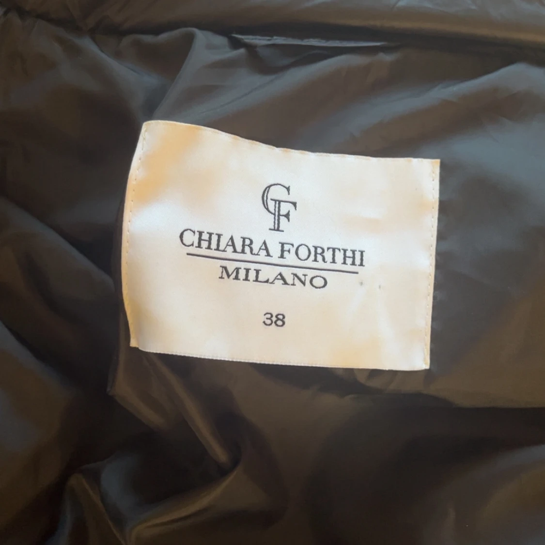 Säljer en svart pufferjacka från Chiara Forthi med stor fluffig fuskpäls på huvan, guldiga dragkedjor och snygg logga på ärmen. Jackan har quiltad design och är perfekt för kalla dagar. Riktigt stilren och trendig modell.