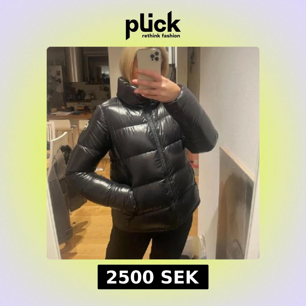 Säljer en svart pufferjacka från Colmar med hög krage och glansig finish. Jackan har en markerad logga på ärmen, dragkedja framtill och breda, quiltade sektioner. Passar mig med s🥰
