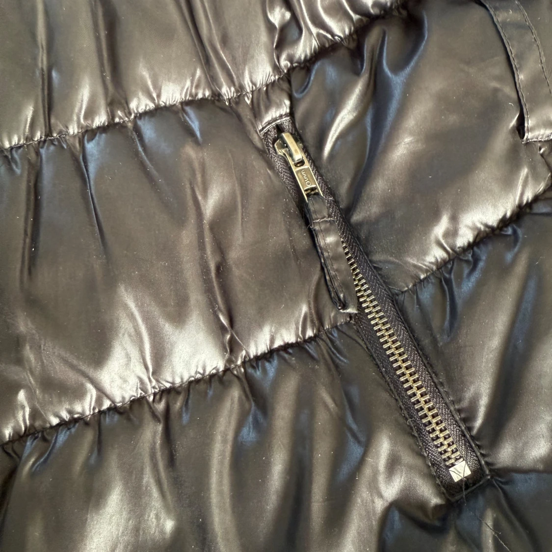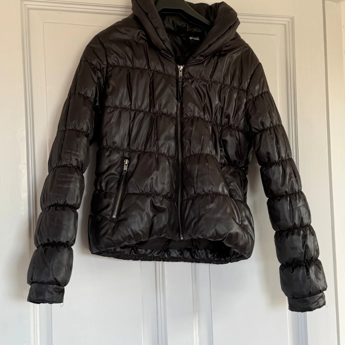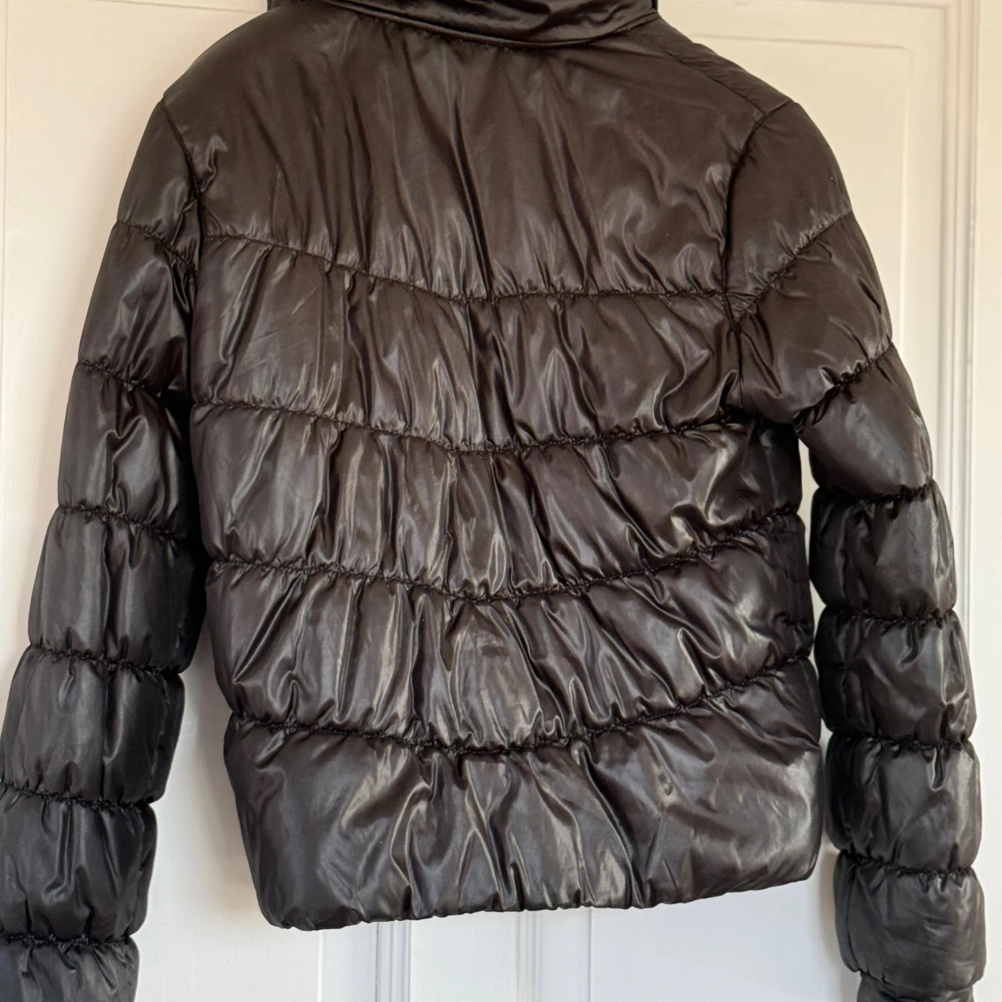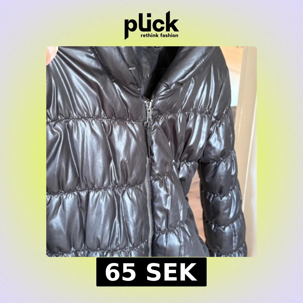 Säljer en svart pufferjacka från Divided med glansig finish och huva. Jackan har dragkedja framtill och två fickor med dragkedja. Perfekt för kyliga dagar och har en riktigt skön, puffig känsla.