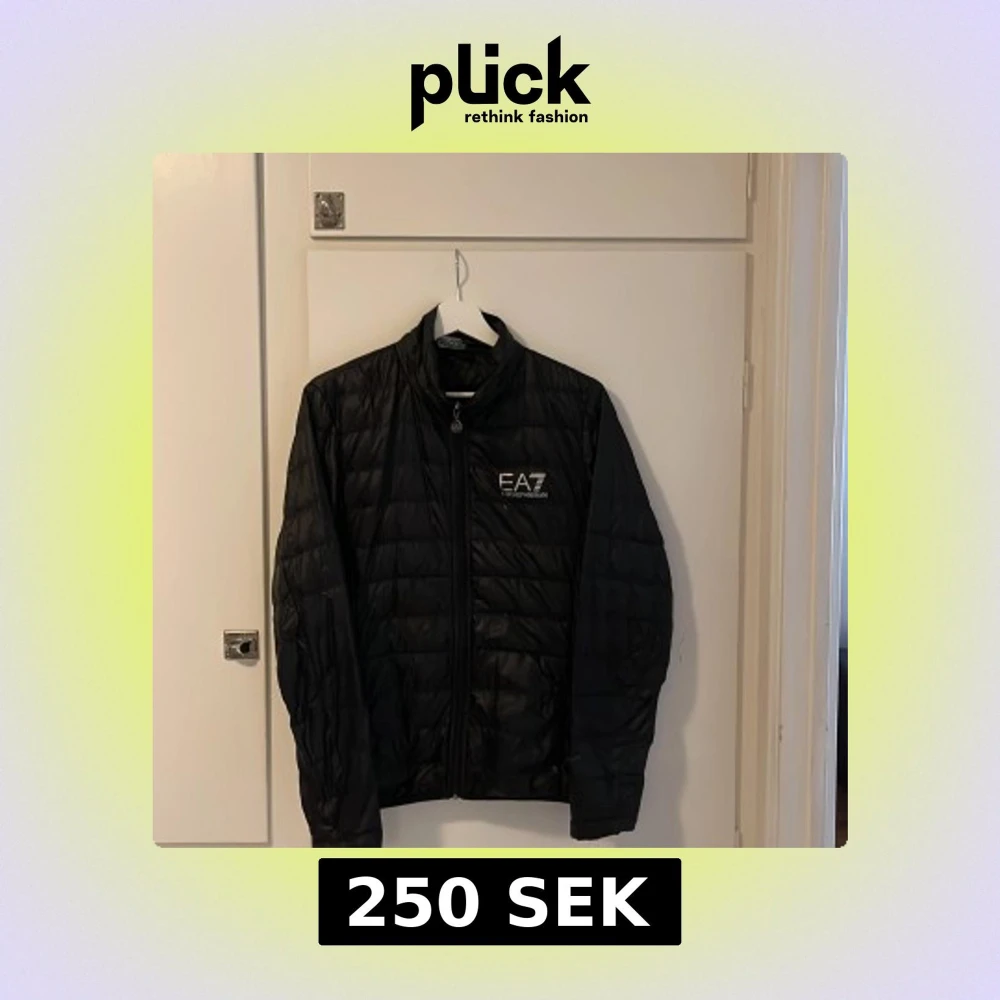 Snygg svart pufferjacka från EA7 Emporio Armani med diskret glansig finish och logga på bröstet. Jackan har dragkedja framtill, ståkrage och quiltad design. Perfekt för dig som vill ha en stilren och sportig look under kyliga dagar. Ett litet hål under märket finns men inget man tänker på jätte mycket.