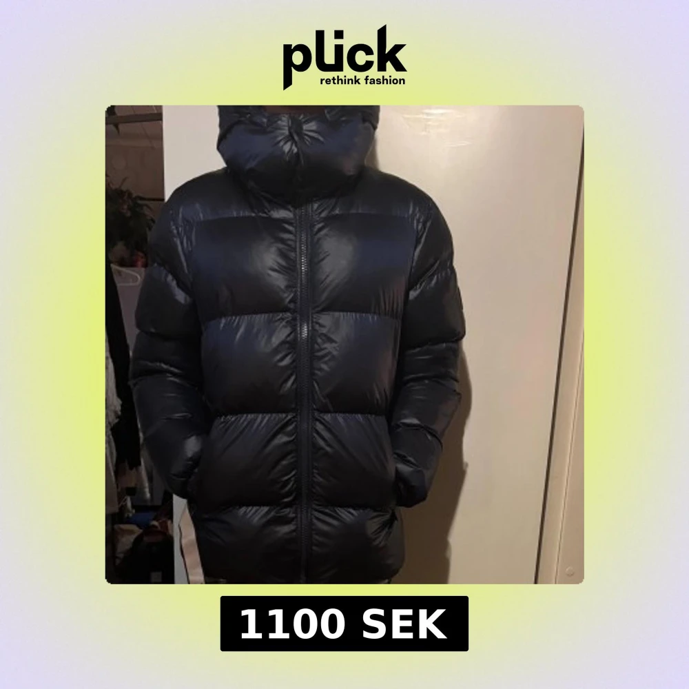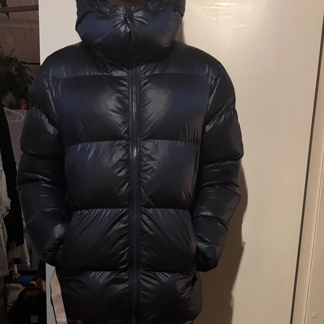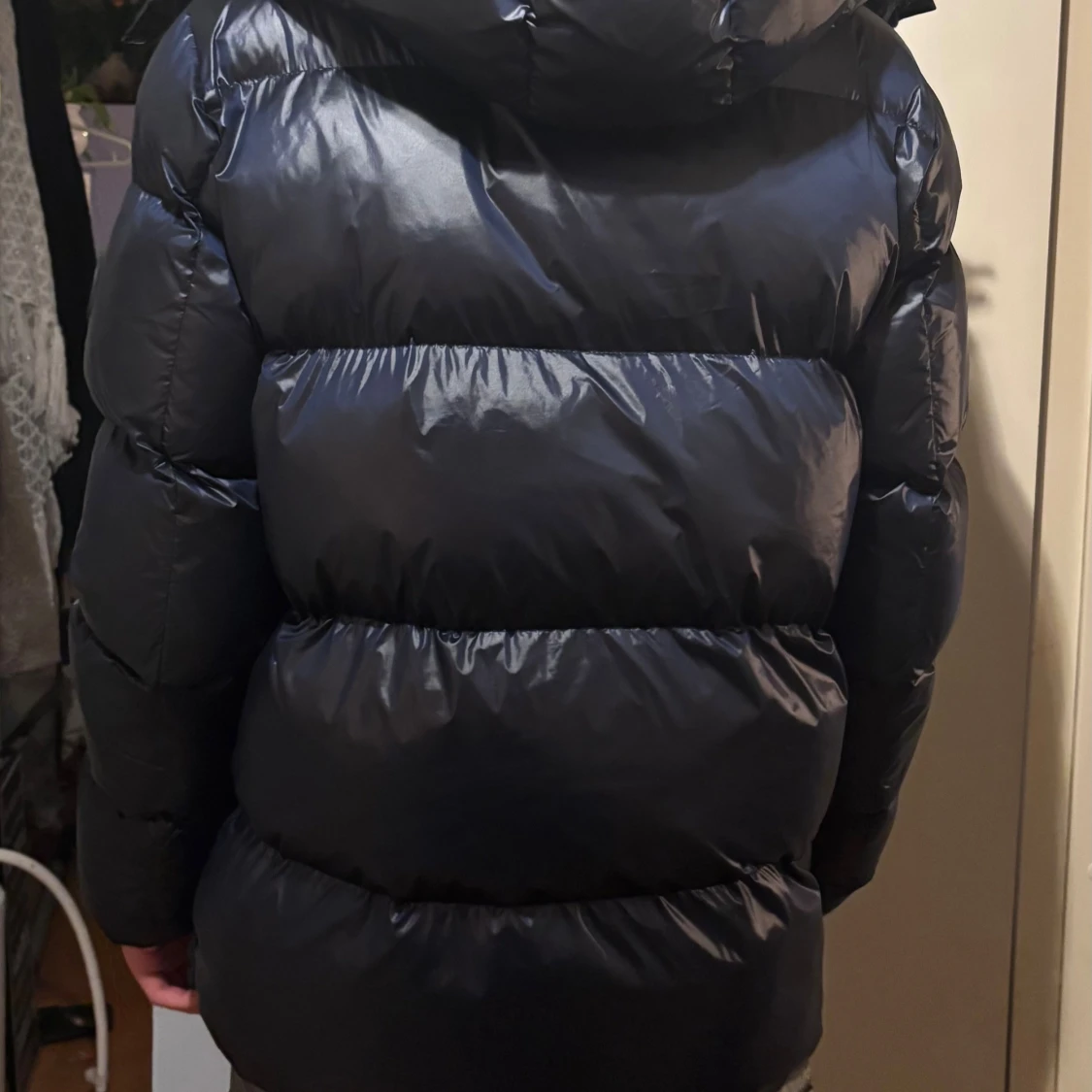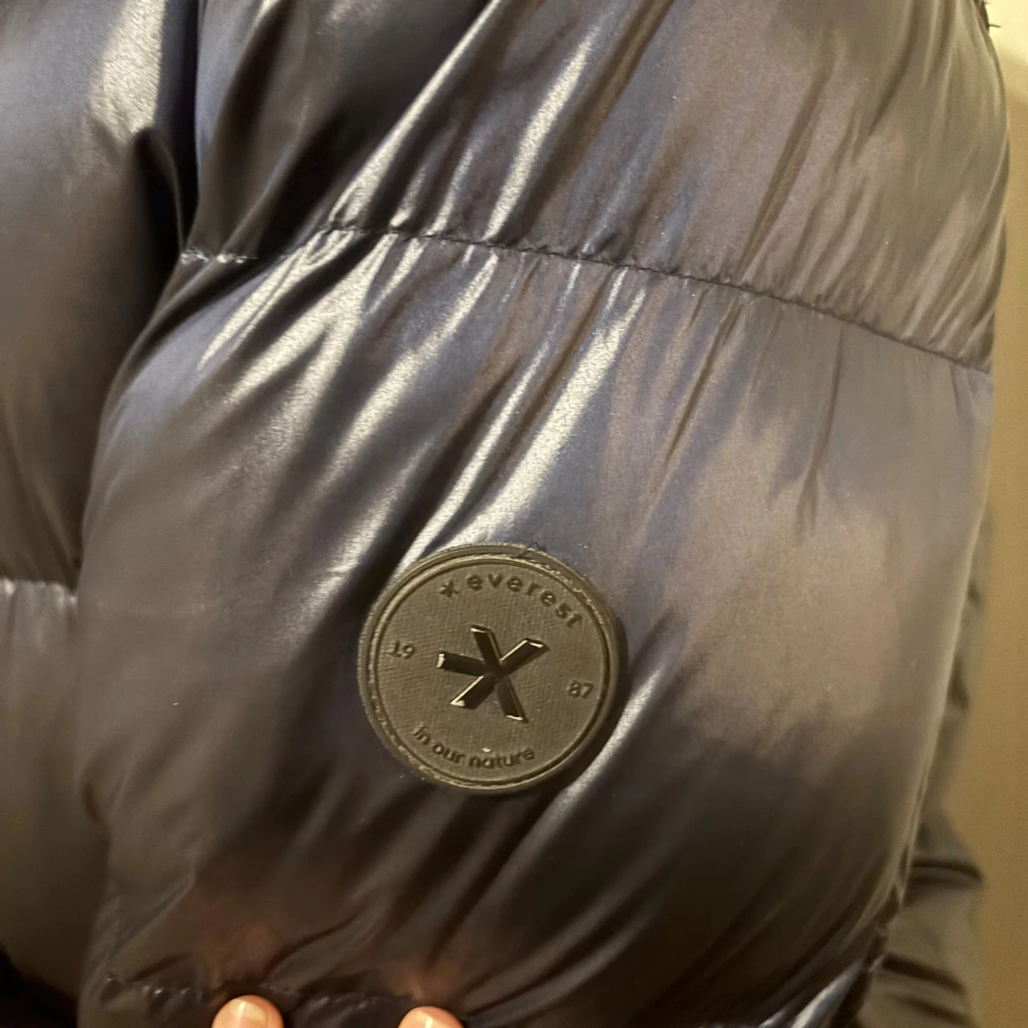 Snygg svart pufferjacka från Everest med hög krage och huva. Jackan har en glansig yta, breda quiltade sektioner och dragkedja framtill. Märkespatch på ärmen och två sidofickor. Perfekt för kalla dagar och riktigt stilren look. Den är S men tycker den är mer en M