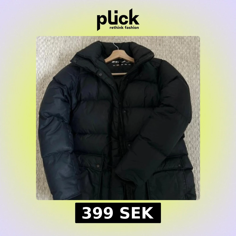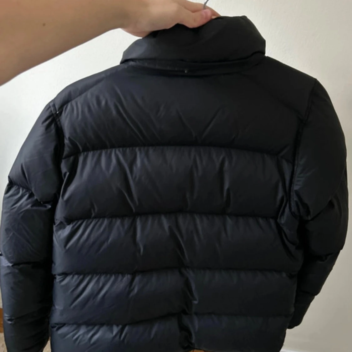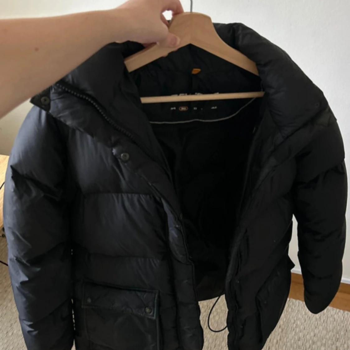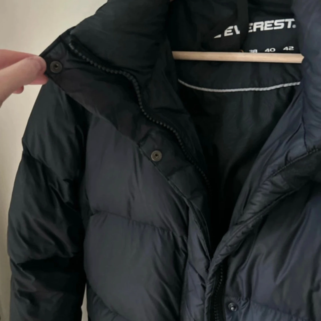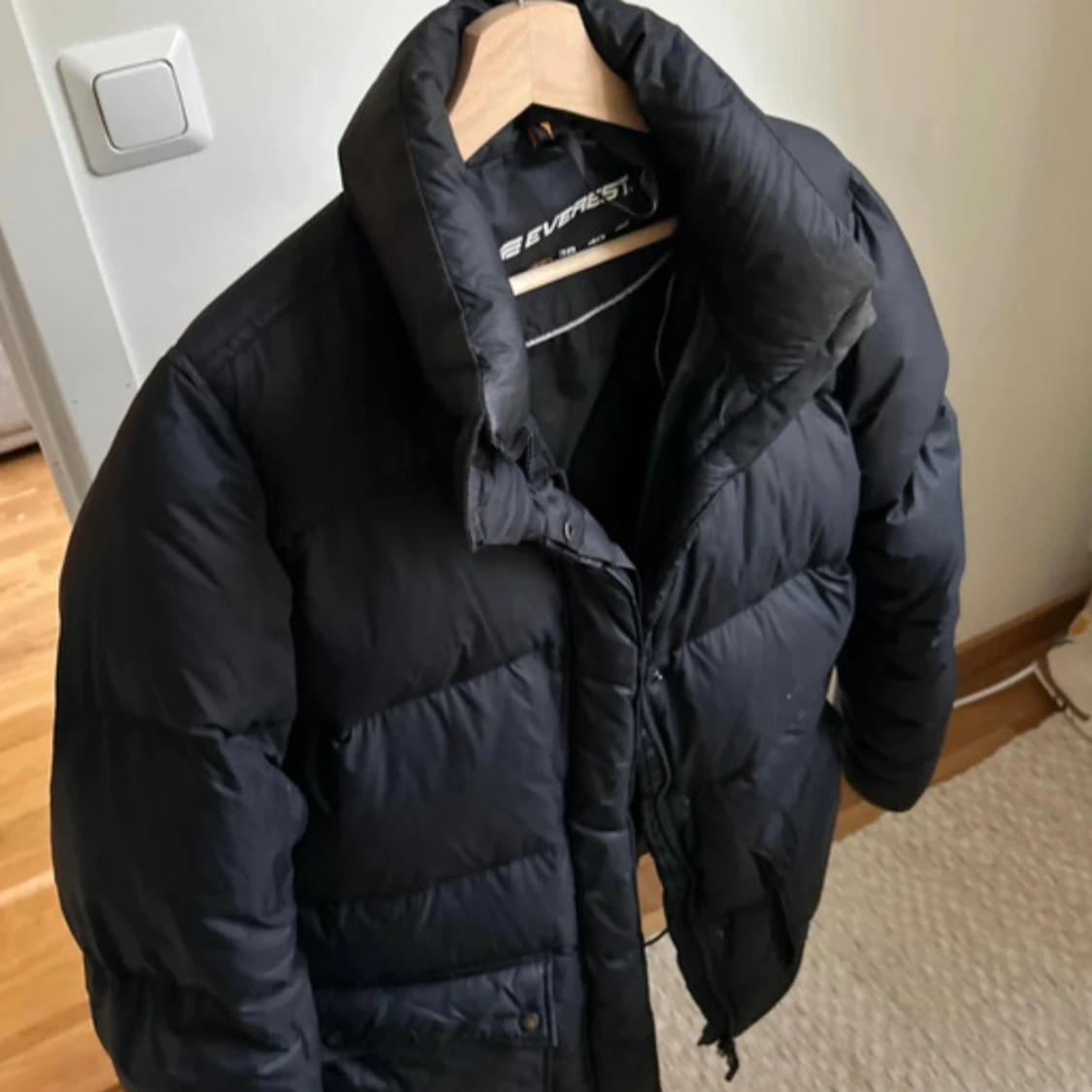 Svart pufferjacka från Everest med hög krage och dragkedja framtill. Jackan har stora fickor med knappar och snörning i midjan för en snygg passform. 80%dun.