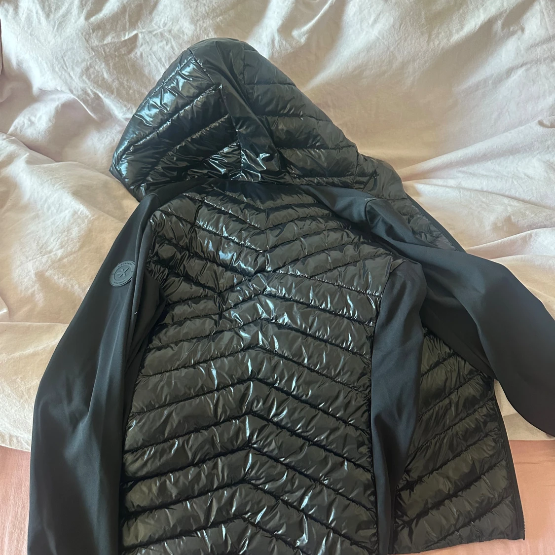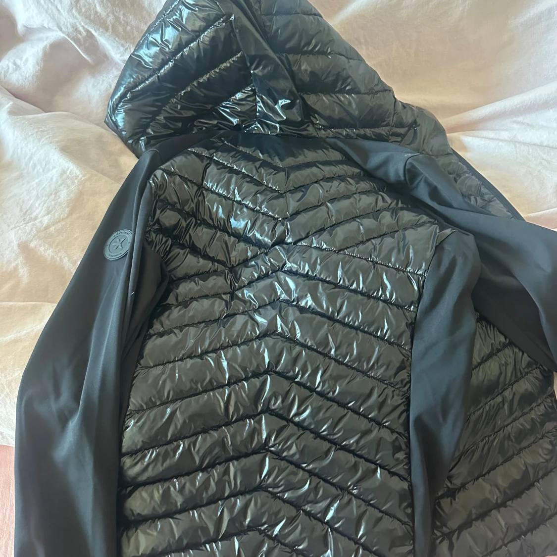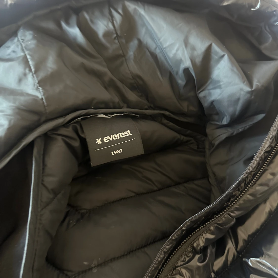Svart pufferjacka från Everest med glansig, quiltad framsida och huva. Jackan har dragkedja framtill och släta svarta ärmar med diskret logotyp på ena armen. Perfekt för kyliga dagar och har en sportig vibe.