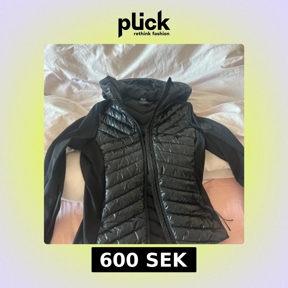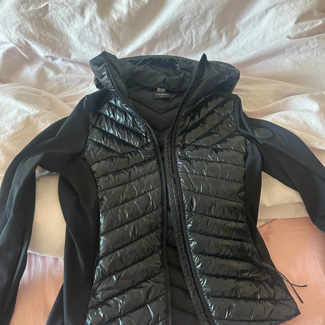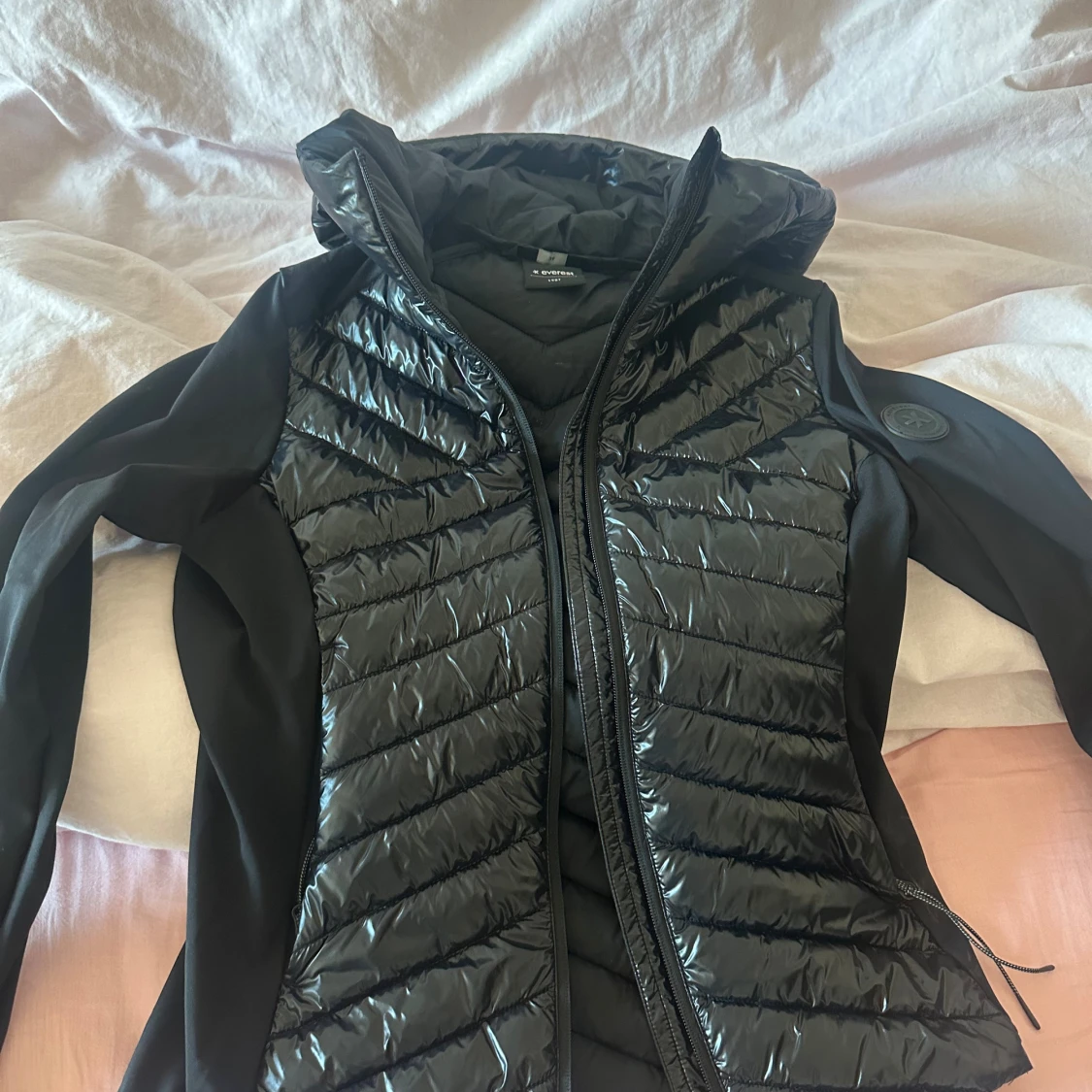 Svart pufferjacka från Everest med glansig, quiltad framsida och huva. Jackan har dragkedja framtill och släta svarta ärmar med diskret logotyp på ena armen. Perfekt för kyliga dagar och har en sportig vibe.