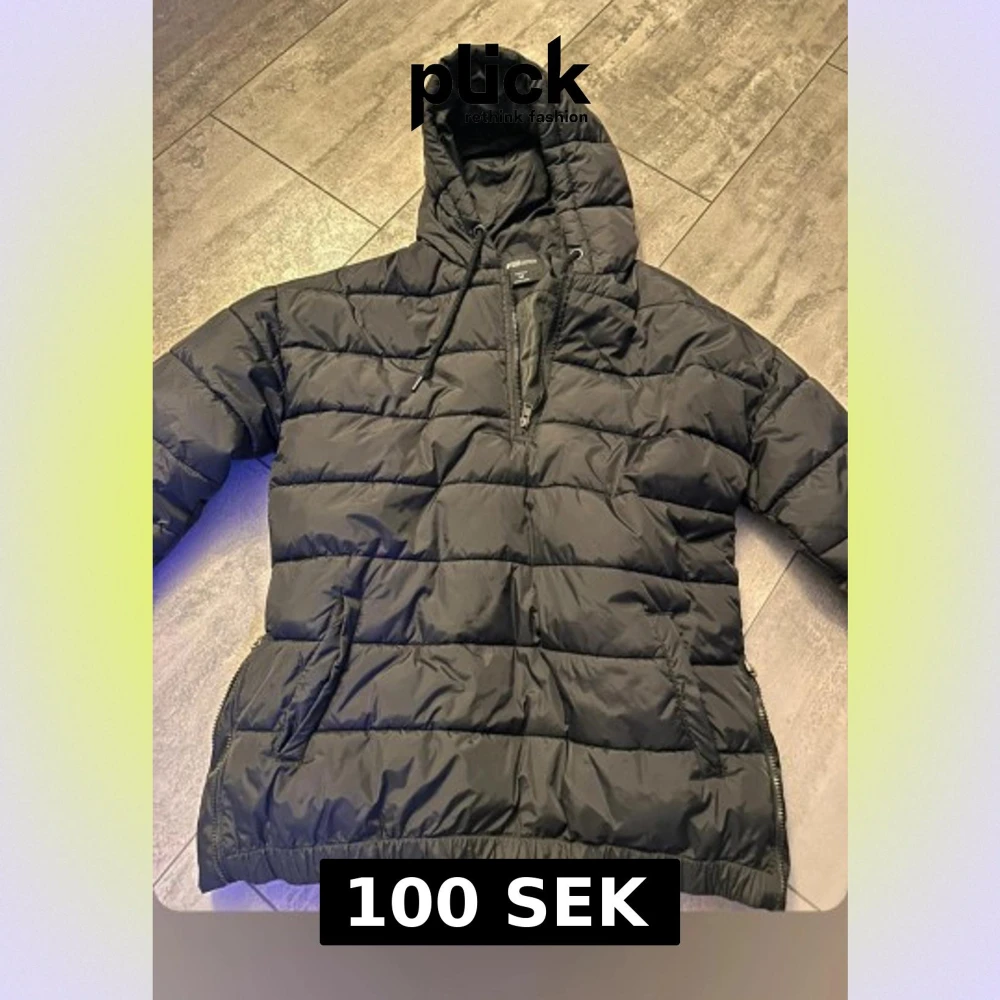 Svart pufferjacka från FB Sister i storlek M. Jackan har huva med snörning, praktiska fickor och en half zip-dragkedja framtill. Tillverkad i syntetmaterial med quiltad design som håller dig varm under kalla dagar. Perfekt för dig som gillar en clean och sportig look.