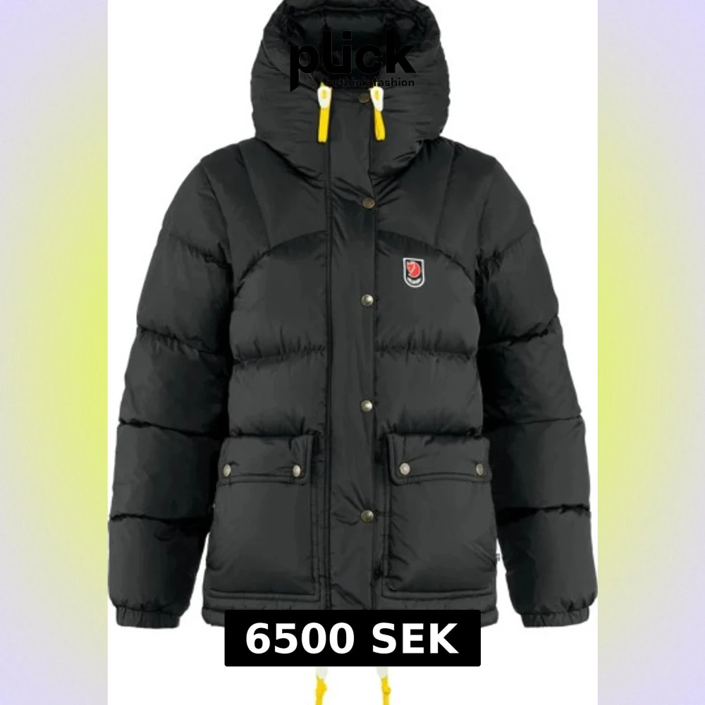 Svart pufferjacka från Fjällräven med gul snörning i huvan och nederkant. Jackan har två stora fickor med knappar, hög krage och Fjällräven-logga på bröstet. Perfekt för kalla dagar med sin tjocka och vadderade design. Pris går att diskutera💕