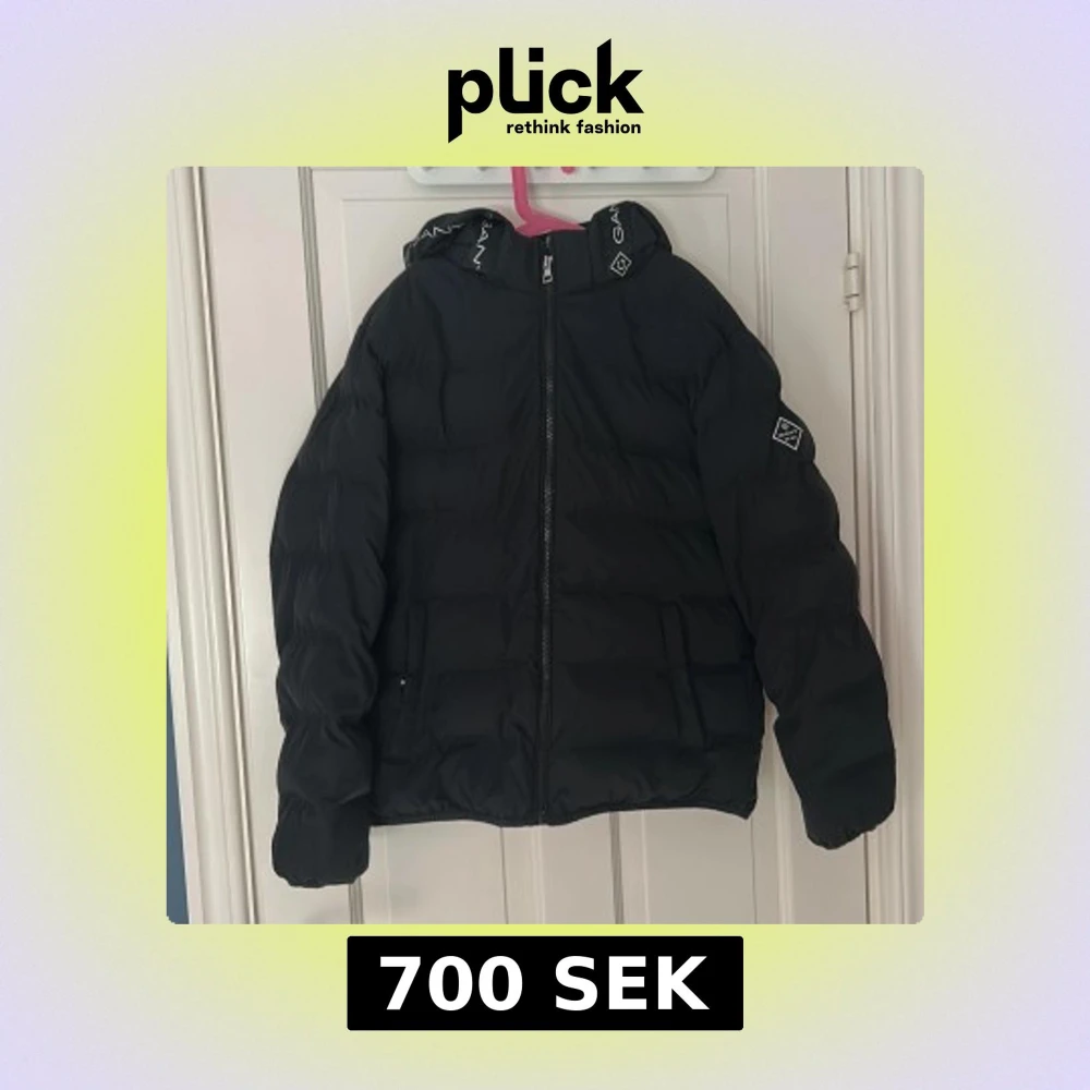 Svart pufferjacka från GANT med huva och dragkedja framtill. Jackan har GANT-logga på ärmen och baktill på huvan. Perfekt för kyligare dagar och har en klassisk, sportig look.