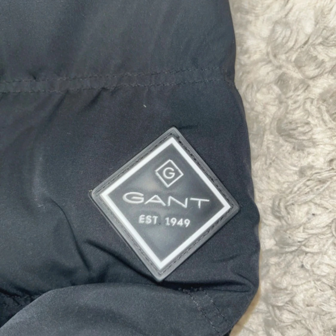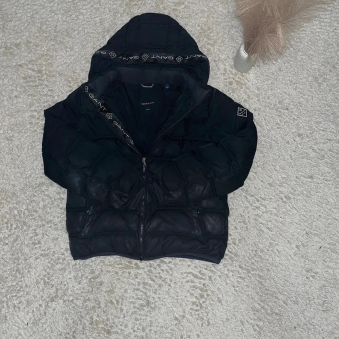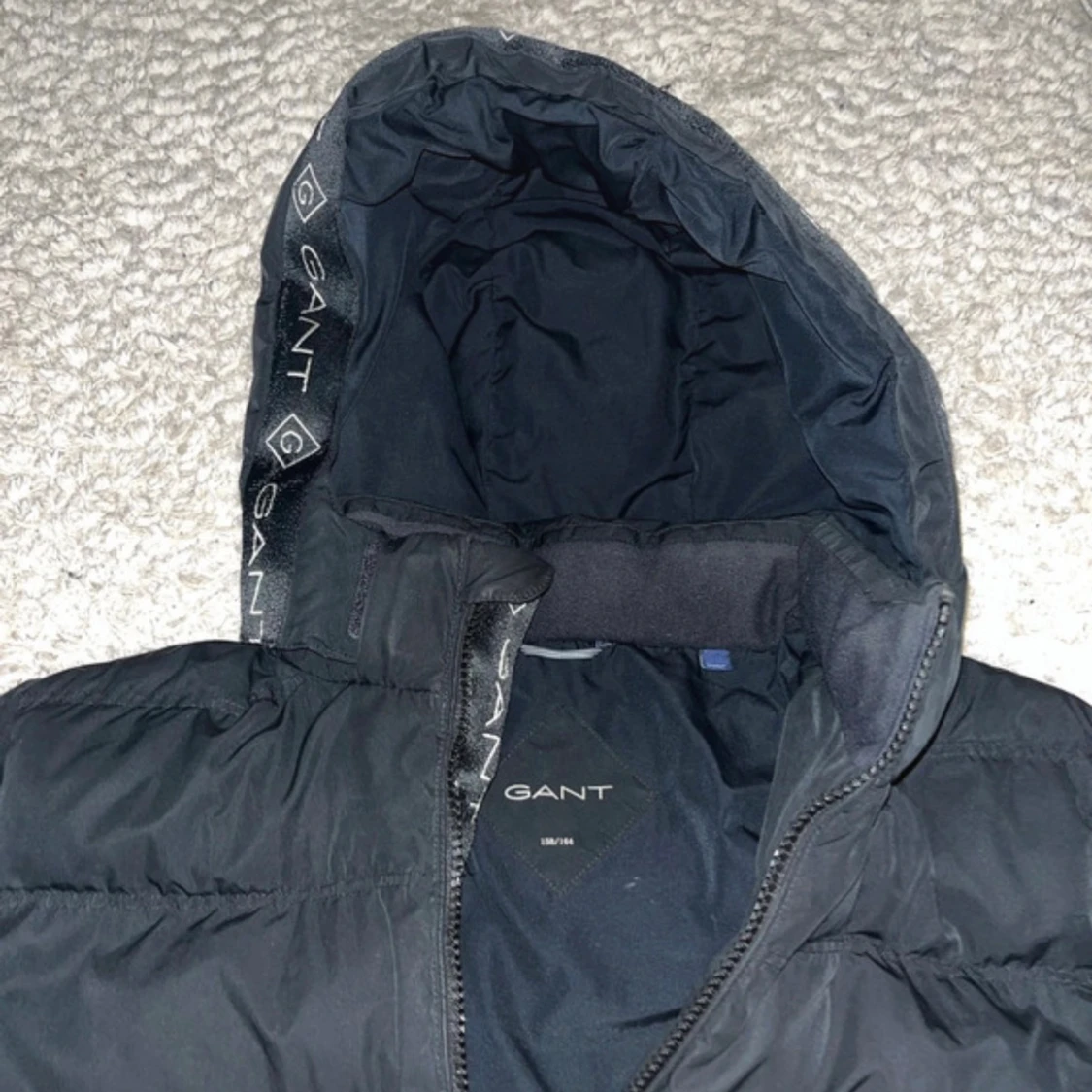 Svart pufferjacka från GANT med stor huva och logotyp på ärmen. Jackan har dragkedja framtill och GANT-tryck på huvkanten. Perfekt för kalla dagar och riktigt snygg streetstil.