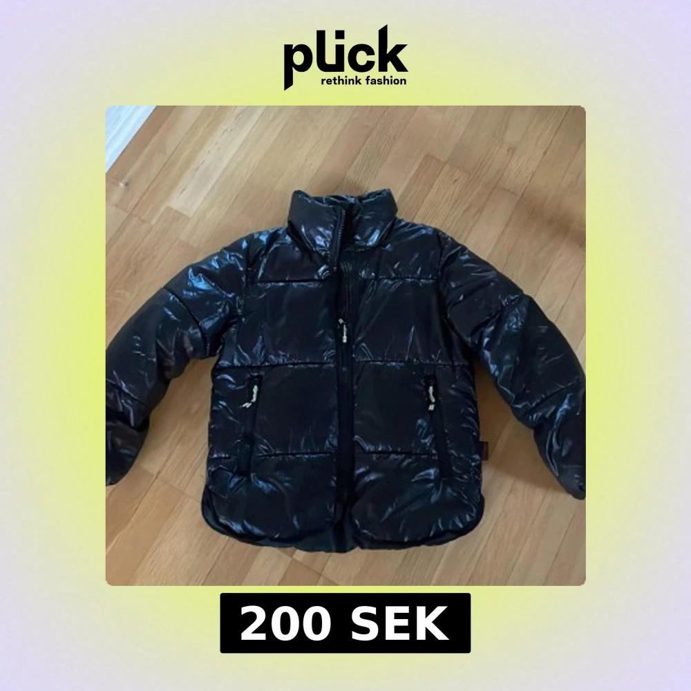 Svart, glansig pufferjacka från H&M med Thermolite EcoMade-foder. Jackan har hög krage, två sidofickor med dragkedja och en klassisk quiltad look. Perfekt för kalla dagar och har en modern, loose passform som är både bekväm och snygg.