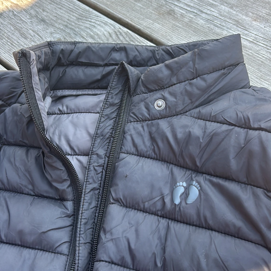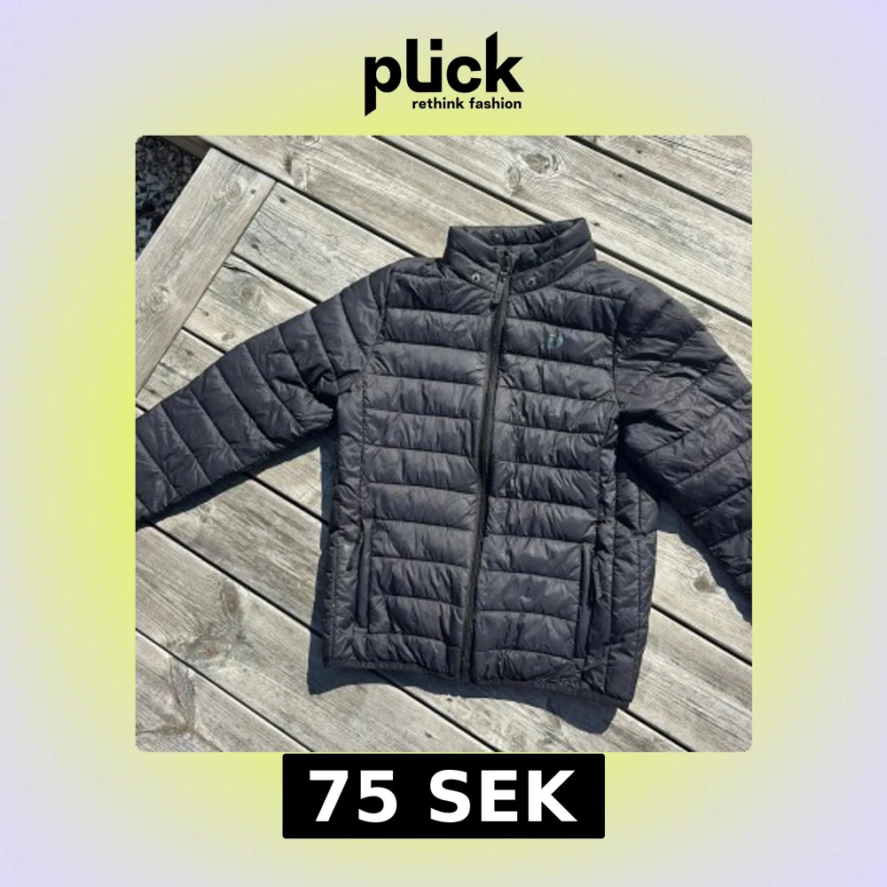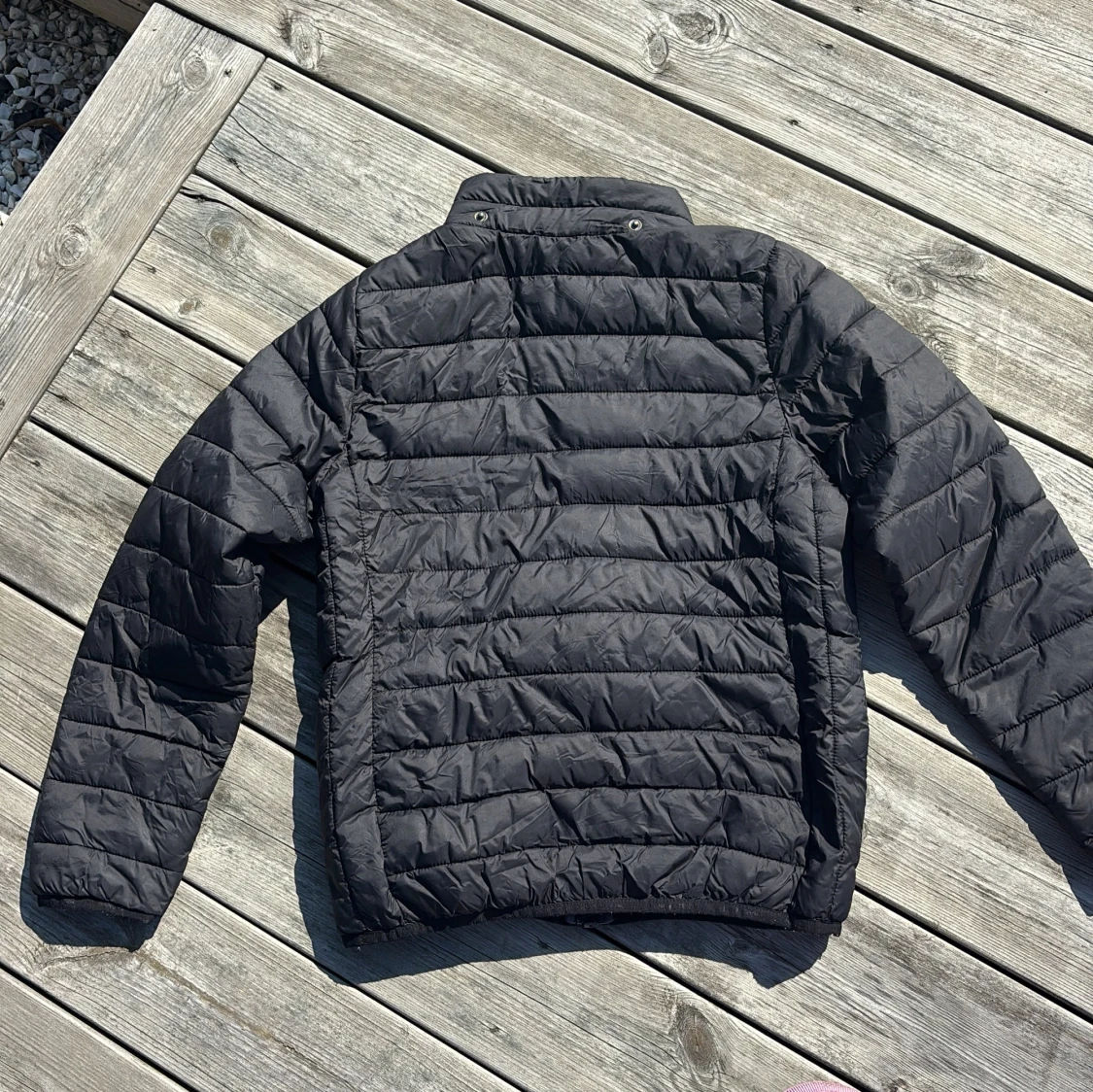 Svart pufferjacka från Hangten med quiltad design och hög krage. Jackan har dragkedja framtill, två sidofickor med dragkedja och diskret logga på bröstet.
