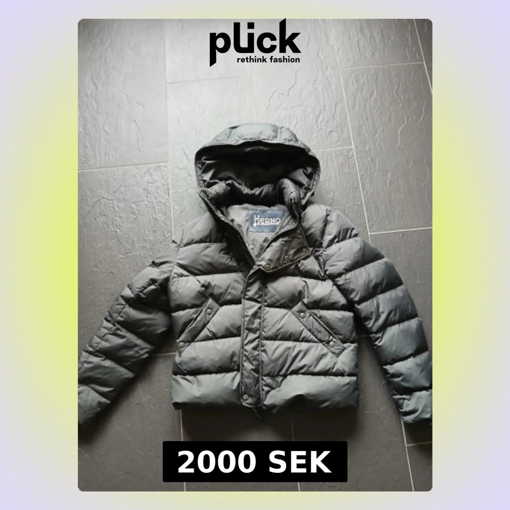 Säljer en svart/mörkgrå pufferjacka från Herno med huva, dragkedja och tryckknappar framtill. Man kan ta av huvan. Strolek s. Grå/svart färg.