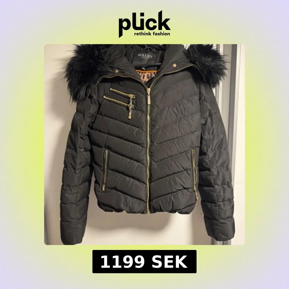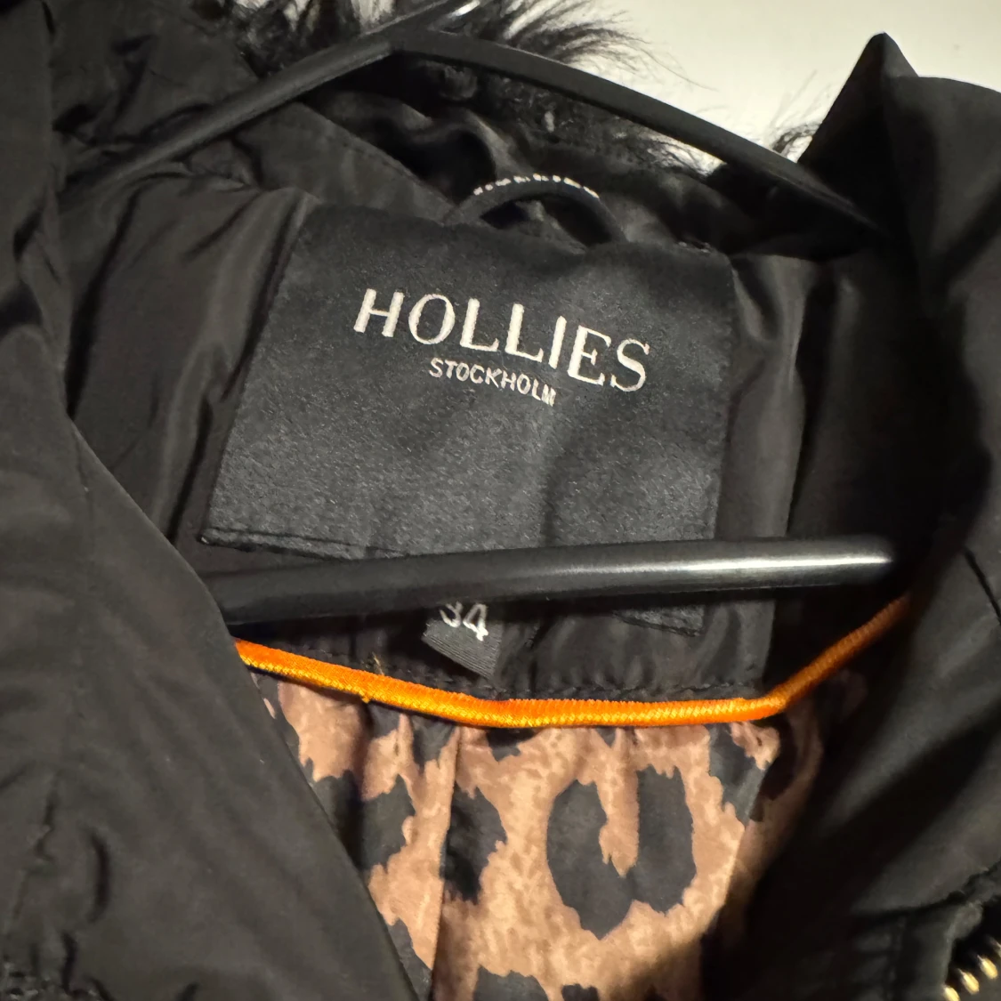 Säljer en svart pufferjacka från Hollies med snygga guldfärgade dragkedjor och fuskpäls på huvan. Jackan har flera fickor med dragkedja och ett leopardmönstrat innerfoder som ger extra edge. Perfekt för kalla dagar när du vill vara både varm och stilren.