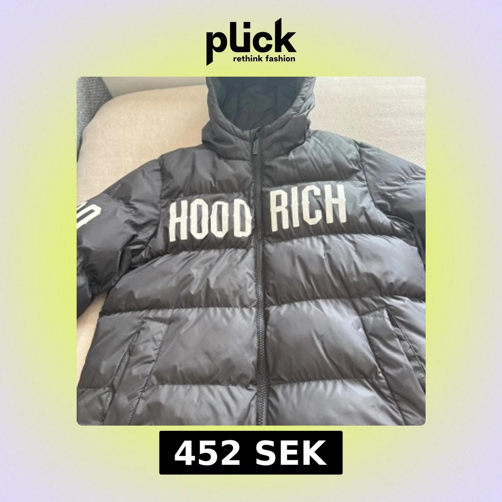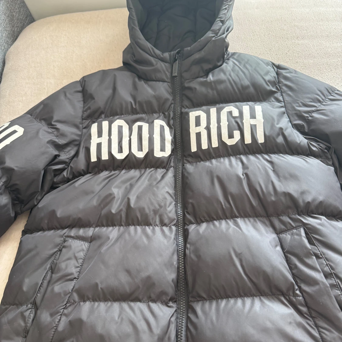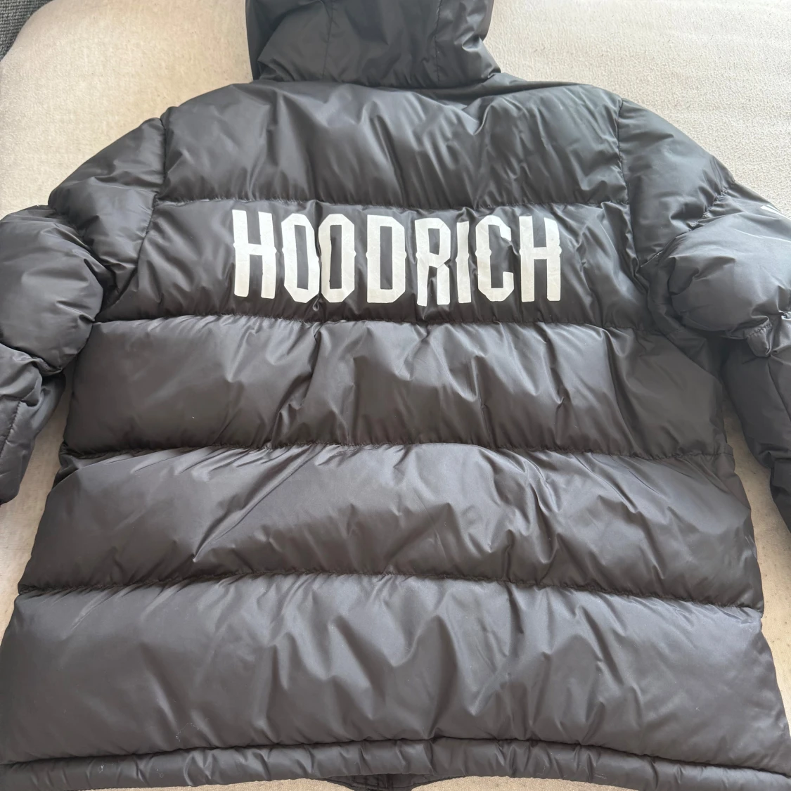 Svart pufferjacka från Hoodrich med stor vit logga på både bröstet och ryggen. Jackan har huva, dragkedja framtill och två sidofickor. Perfekt för kalla dagar när du vill ha en streetstyle-look.