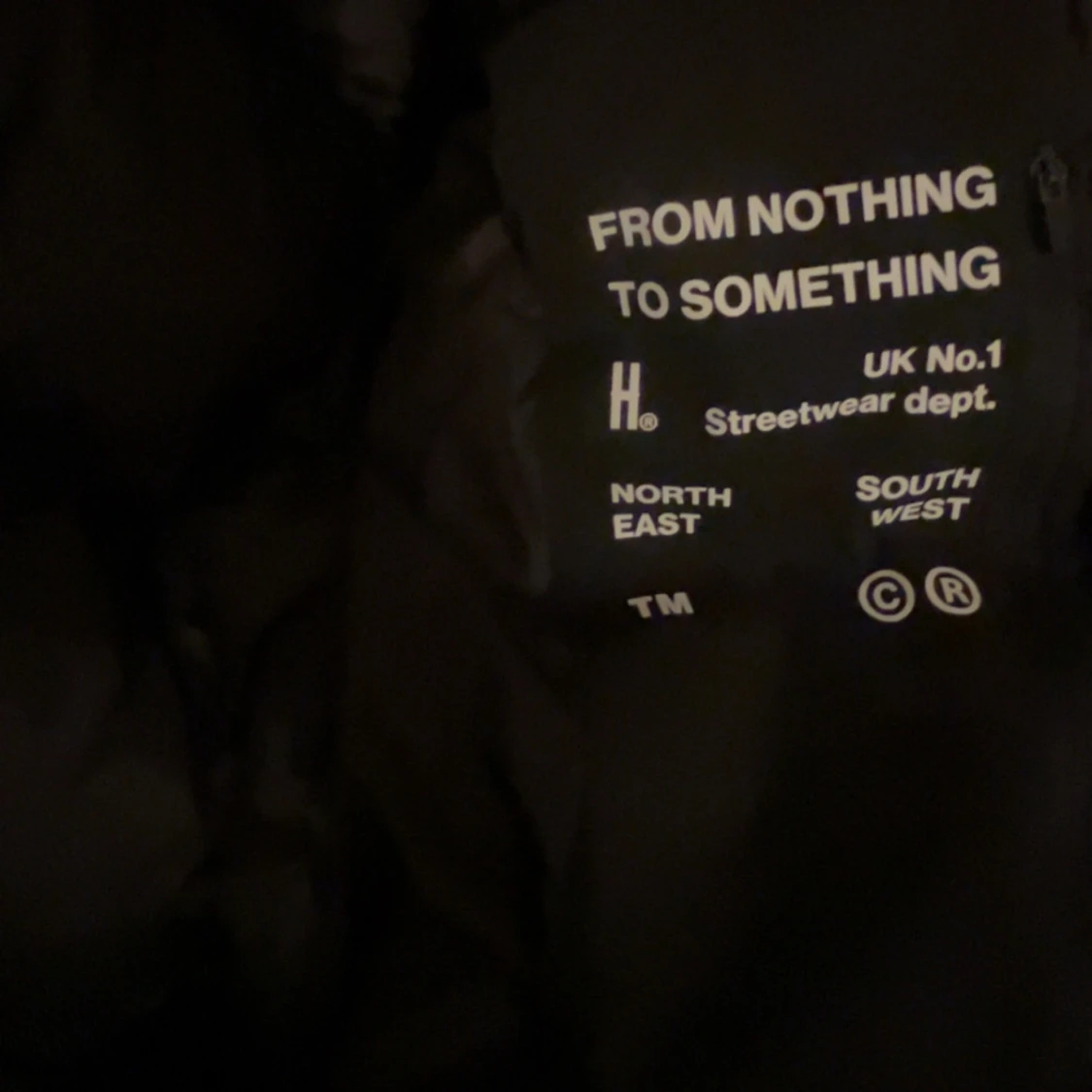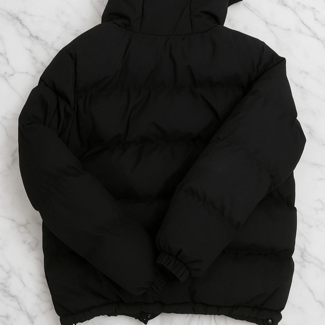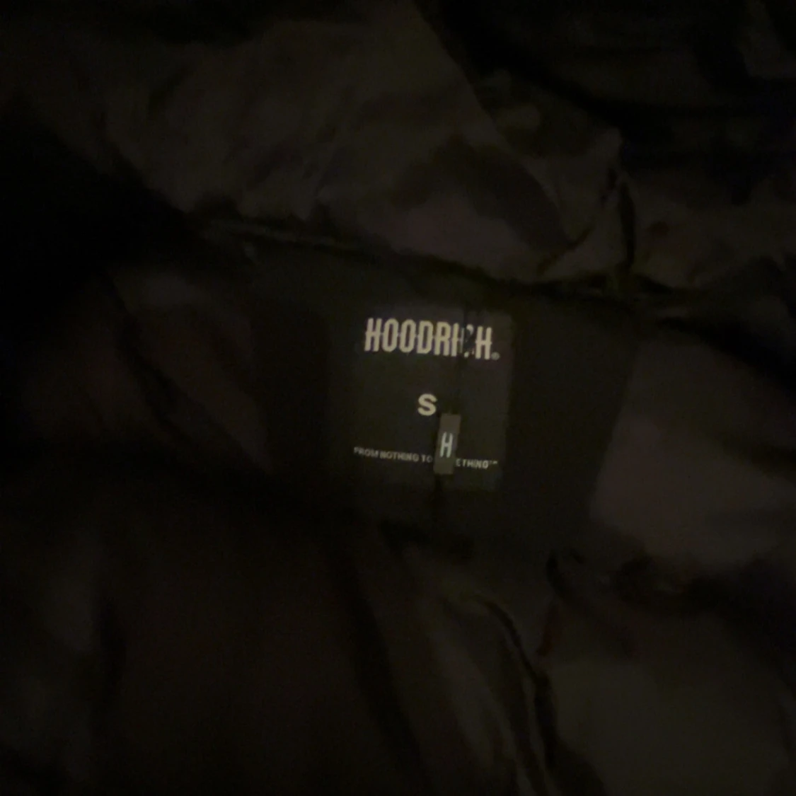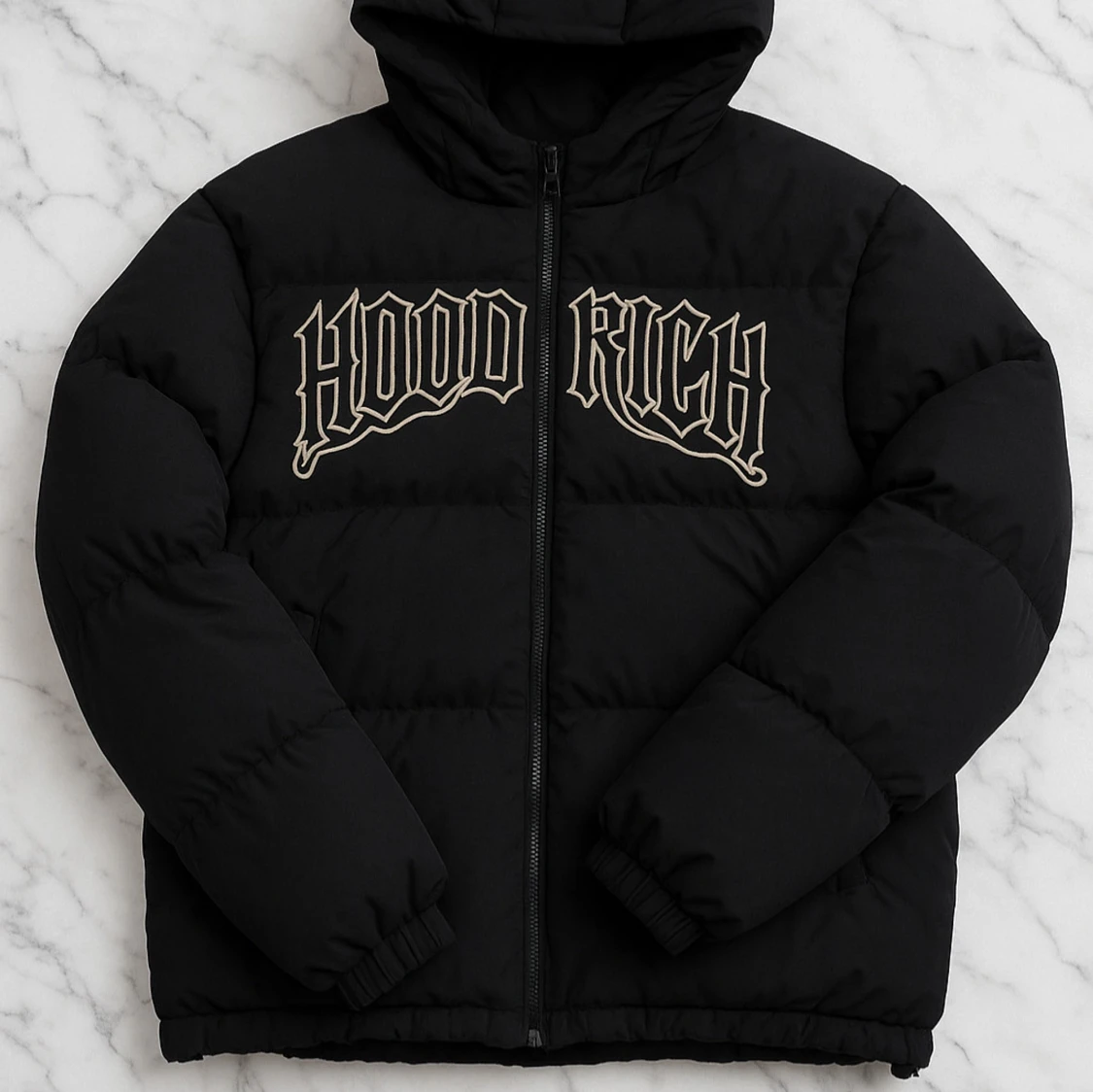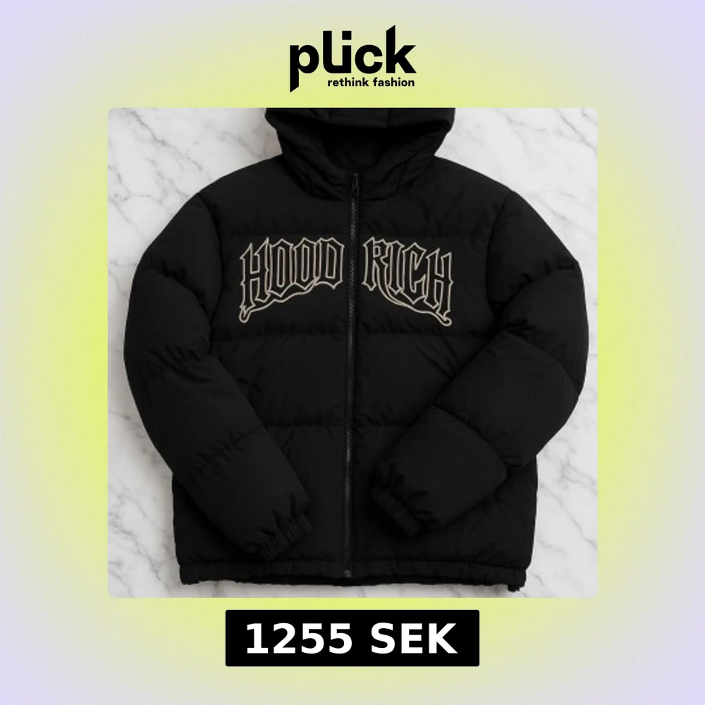 Säljer en svart pufferjacka från Hoodrich med stor broderad logga på bröstet. Jackan har huva, dragkedja framtill och elastiska muddar vid ärmslut och nederkant. Perfekt för kalla dagar och streetwear-stil.