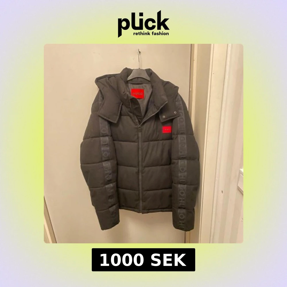Svart pufferjacka från Hugo med huva och snygga logodetaljer på ärmarna. Jackan har en röd Hugo-label på bröstet, dragkedja framtill och quiltad design. Insidan är fodrad med svart tyg och röda sömmar. Perfekt för kalla dagar.