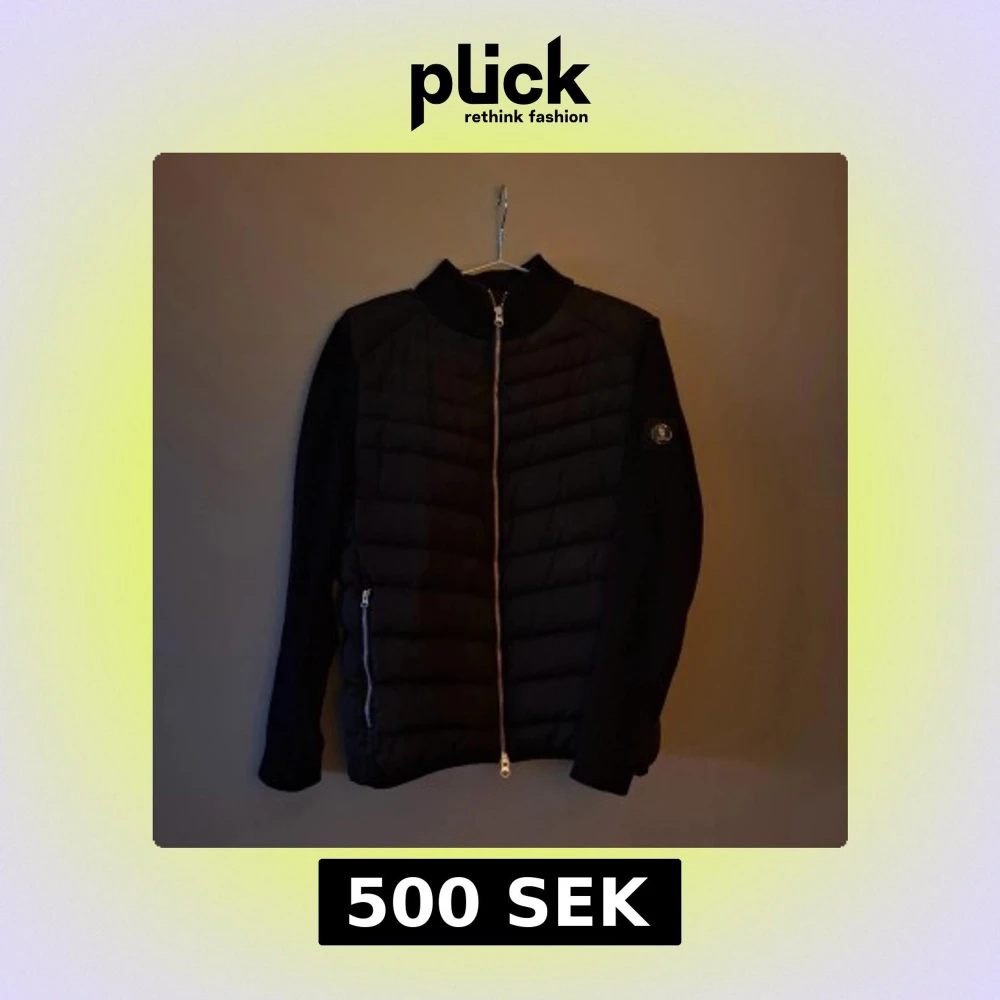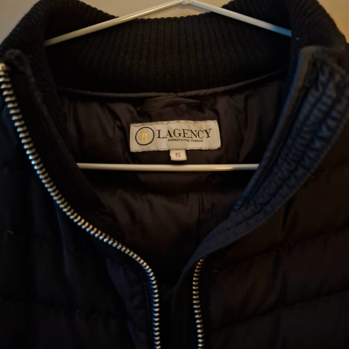 Svin snygg Svart pufferjacka från Lagency i storlek S. Jackan har quiltad framsida och rygg, stickade ärmar och krage samt dragkedja framtill och på fickorna. Klassisk och stilren look med Lagency-logga på ärmen. Det är ett litet hål vid vänstra handleden, därför priset. Det är inget man lägger märke till. Den sitter jätte bra, och passar dom som är runt 165-175cm.