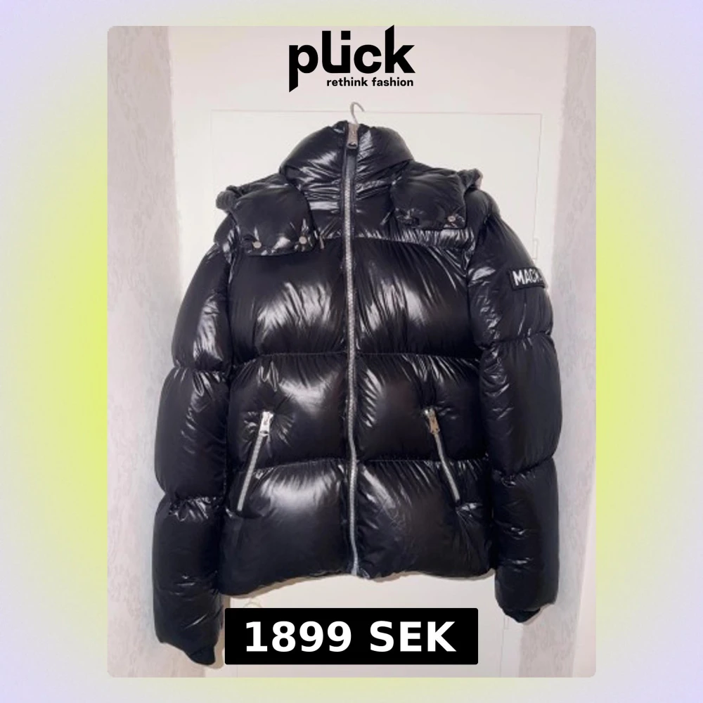 Snygg svart pufferjacka från Mackage med glansig finish, hög krage och avtagbar huva. Jackan har två dragkedjeförsedda fickor framtill och tydlig logga på ärmen. Perfekt för kalla dagar när du vill hålla stilen. Storlek 38 vilket motsvarar M/L