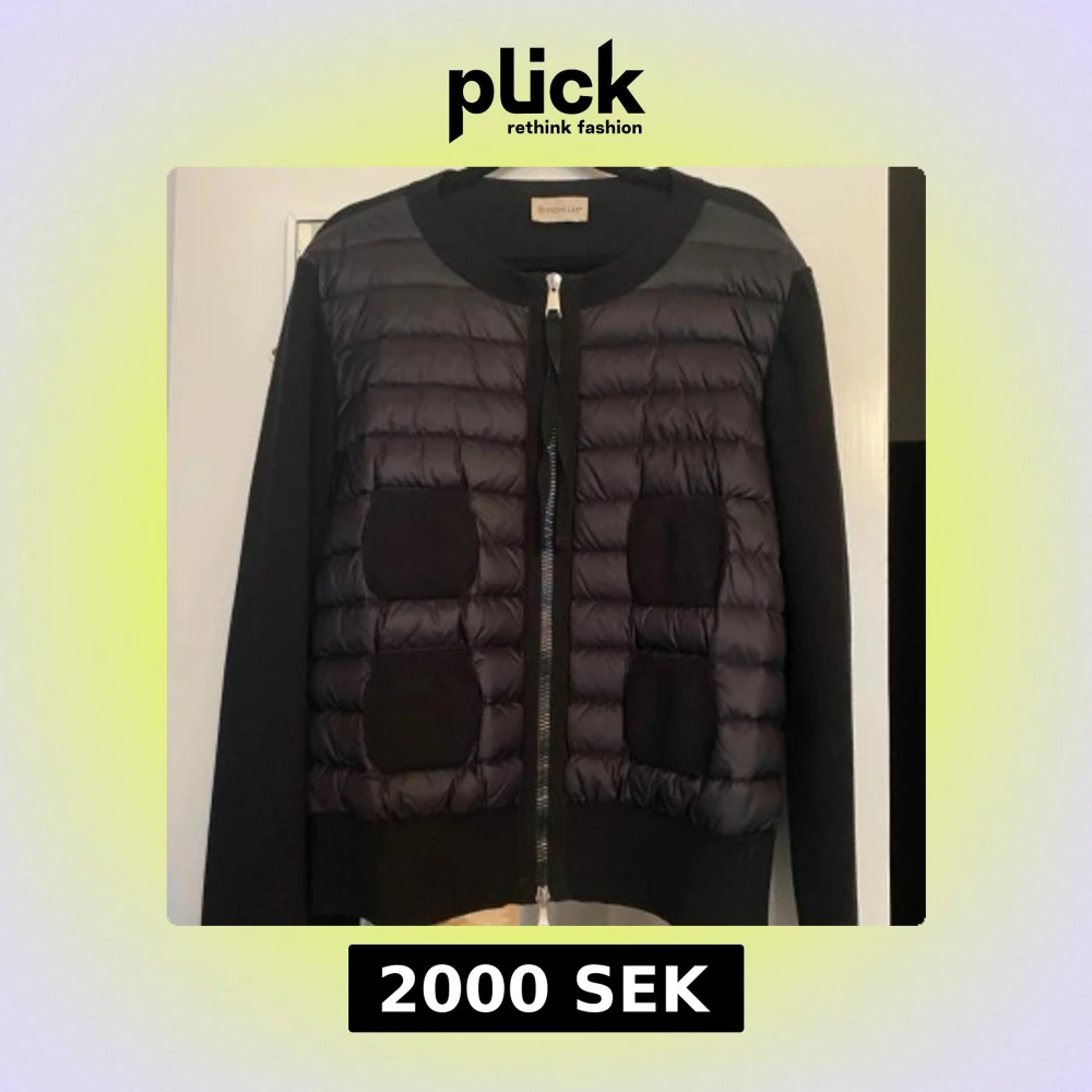 Snygg svart pufferjacka från Moncler med quiltad framsida och stickade ärmar. Jackan har rund halsringning, dragkedja framtill och coola svarta detaljer på bröstet. Perfekt för dig som vill ha en stilren och trendig look.