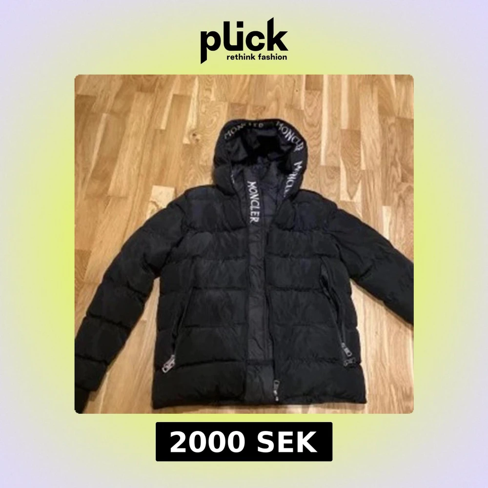 Säljer en svart pufferjacka från Moncler med huva och logotyp på insidan av kragen. Jackan har dragkedjor på fickorna och framtill, samt quiltad design som ger en cool och sportig look.