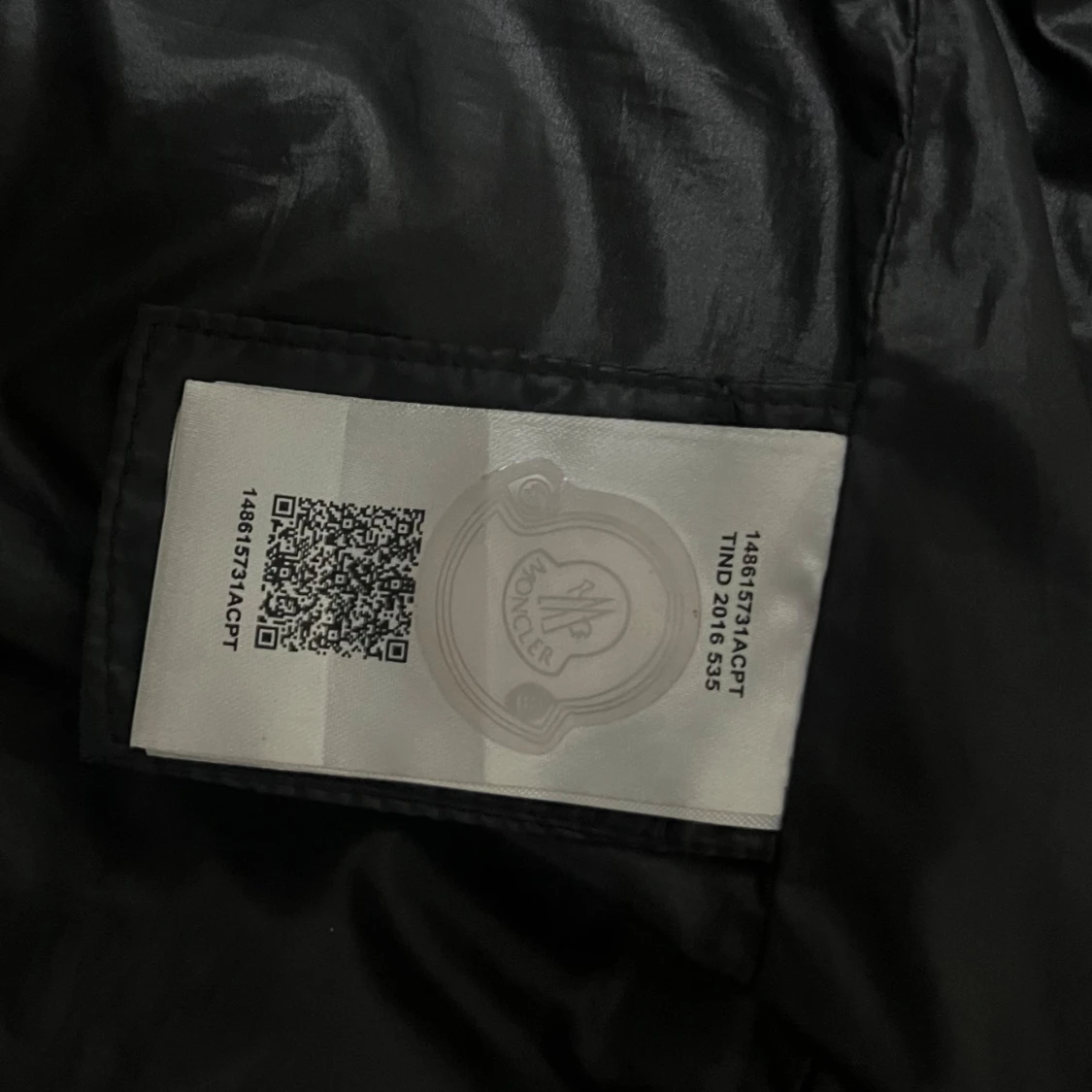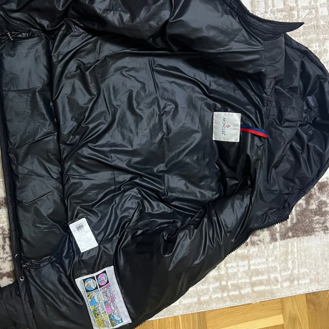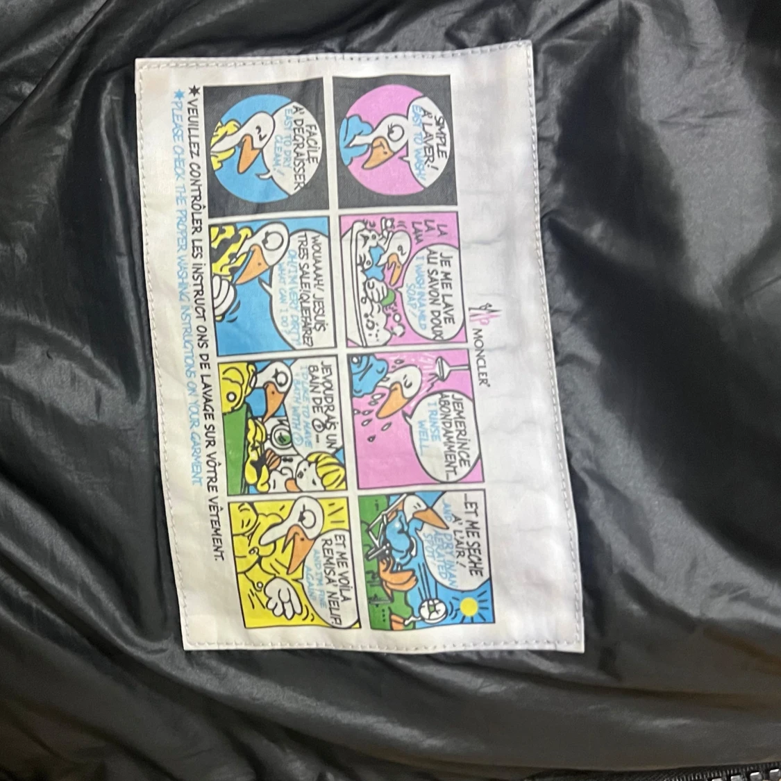 Säljer en snygg svart pufferjacka från Moncler. Jackan har en dragkedja framtill och praktiska fickor med dragkedjor. Den är perfekt för kalla dagar med sin varma och vadderade design. Inuti finns en cool serietidningsdetalj som ger jackan en unik touch. Perfekt för vintern!