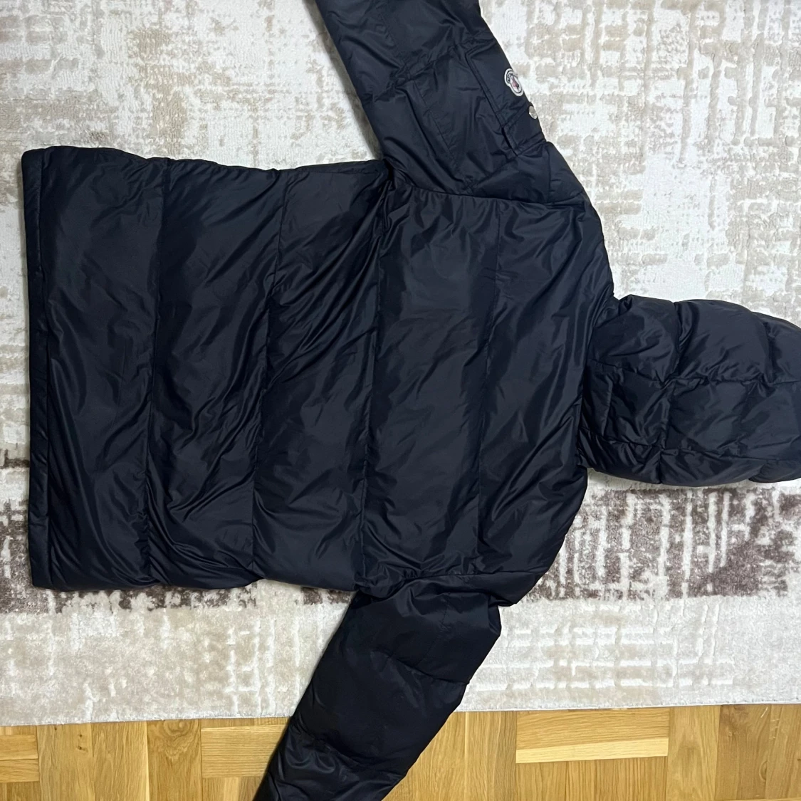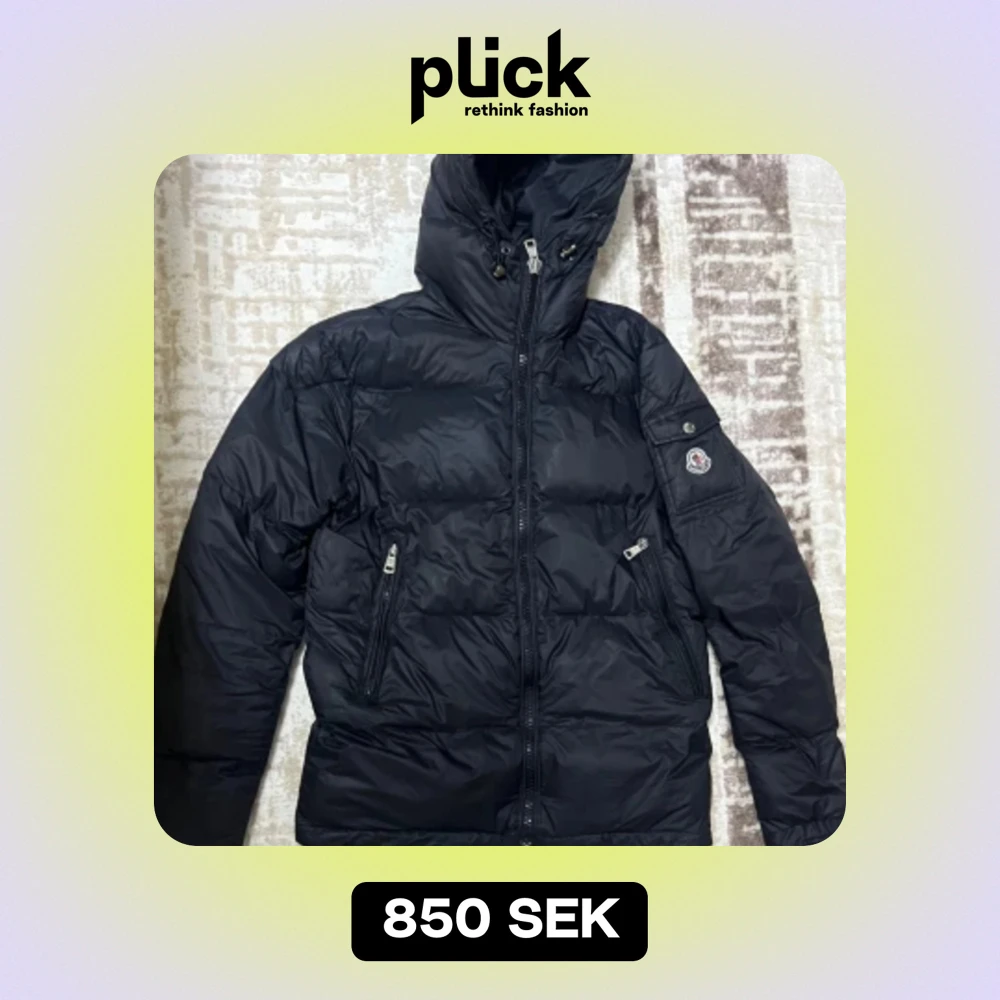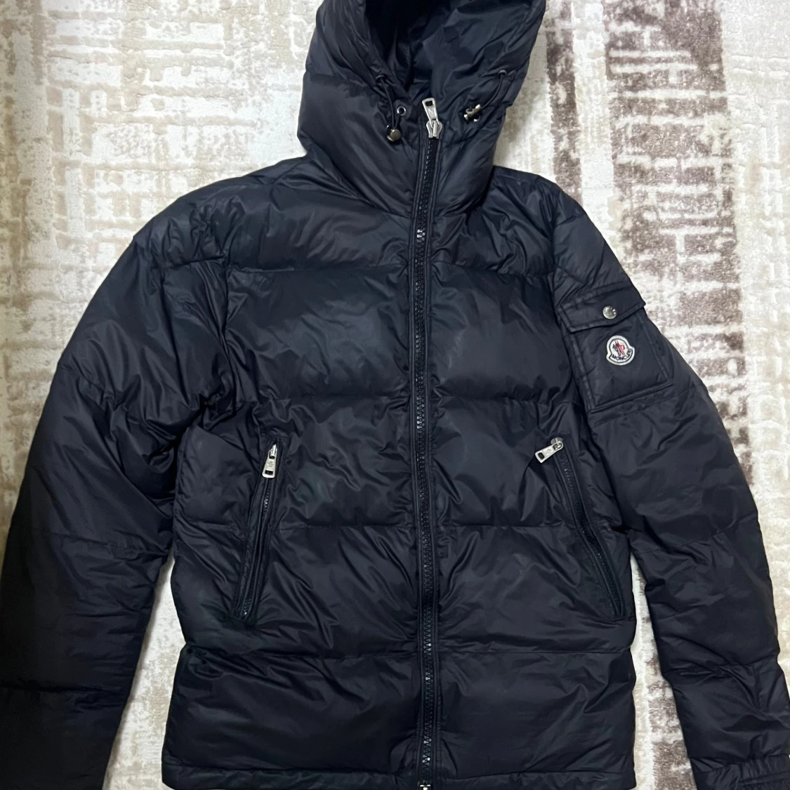 Säljer en snygg svart pufferjacka från Moncler. Jackan har en dragkedja framtill och praktiska fickor med dragkedjor. Den är perfekt för kalla dagar med sin varma och vadderade design. Inuti finns en cool serietidningsdetalj som ger jackan en unik touch. Perfekt för vintern!