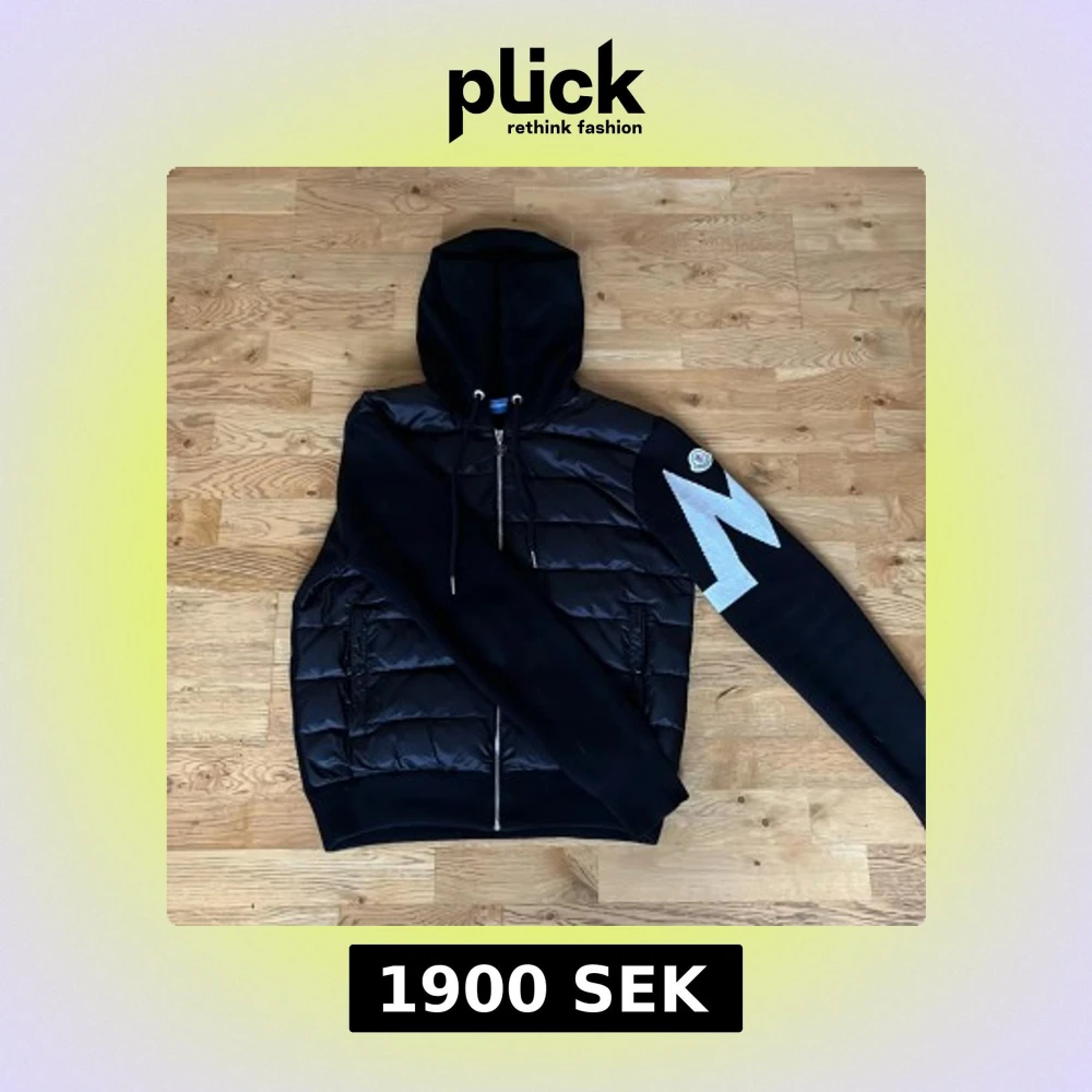 Svart pufferjacka från Moncler med huva och dragkedja framtill. Jackan har quiltade partier på framsidan, släta ärmar och en vit blixtdetalj på ena ärmen. Två fickor med knapp och ribbade muddar. Säljes för 2100 då skickat är perfekt men kan diskuteras. Storleken är L men passar M och S