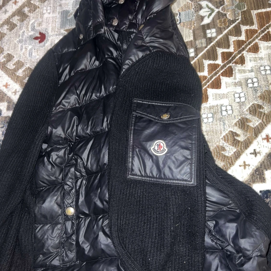 Snygg svart pufferjacka från Moncler med quiltad design och huva. Jackan har långa ärmar i stickat material och en dragkedja framtill. Perfekt för kyligare dagar.