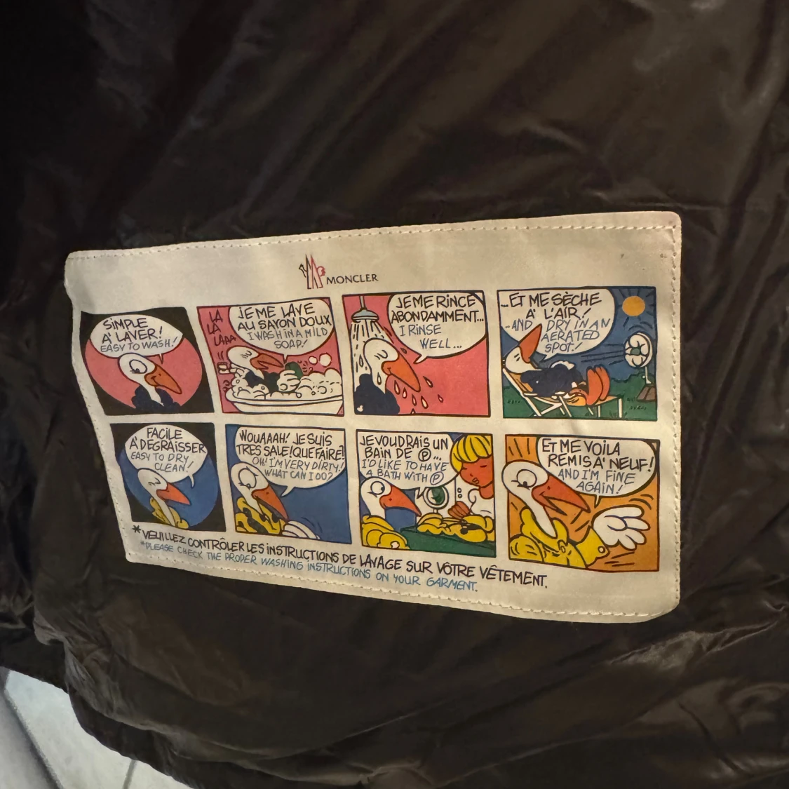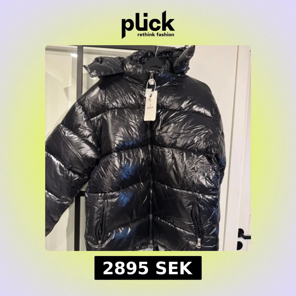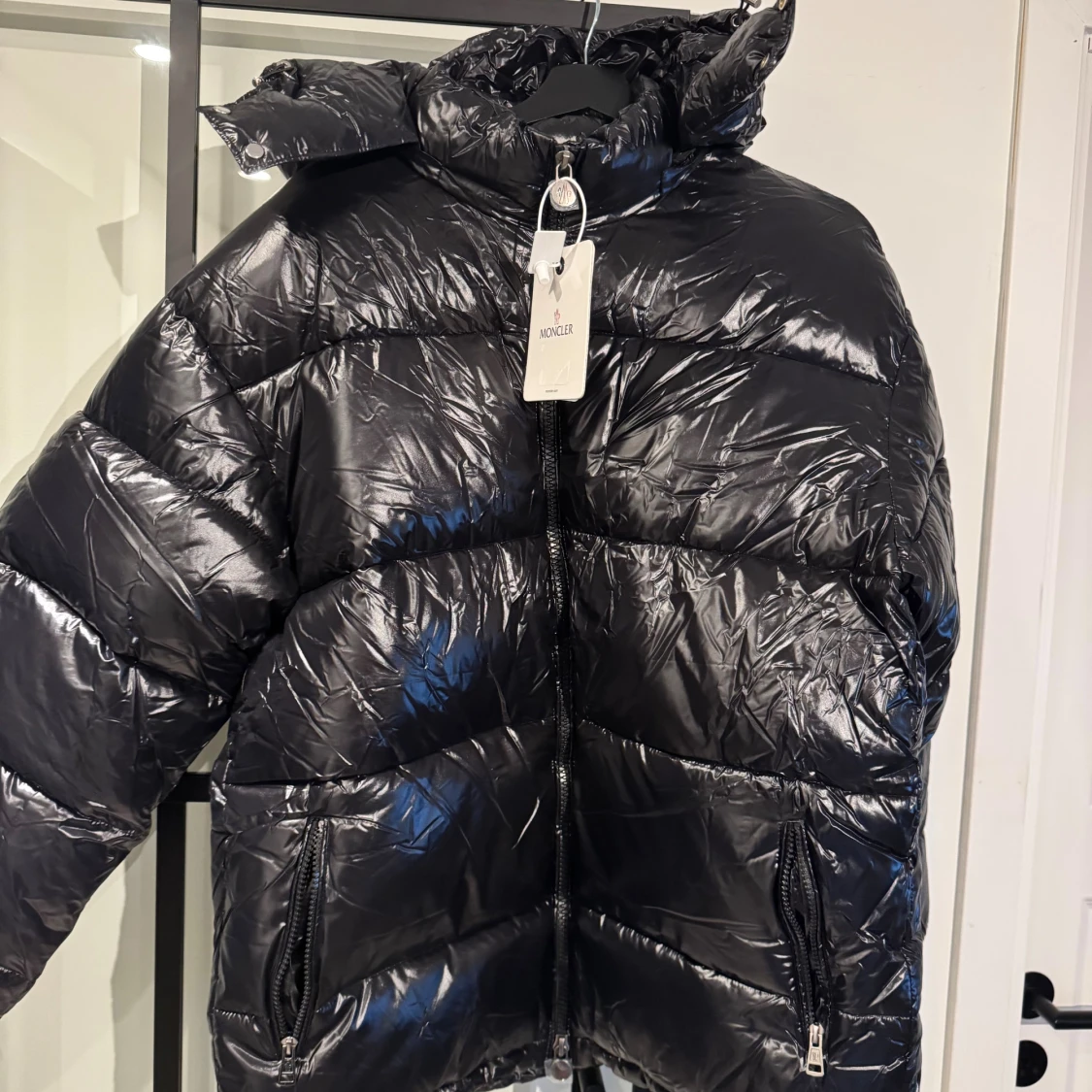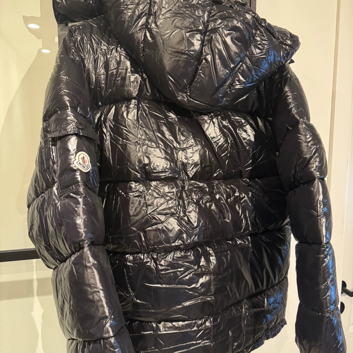Svart pufferjacka från Moncler med glansig finish och huva. Jackan har två dragkedjeförsedda fickor framtill, Moncler-logga på ärmen och coolt serietryck på insidan. Perfekt för dig som vill ha en varm och snygg jacka med streetkänsla.