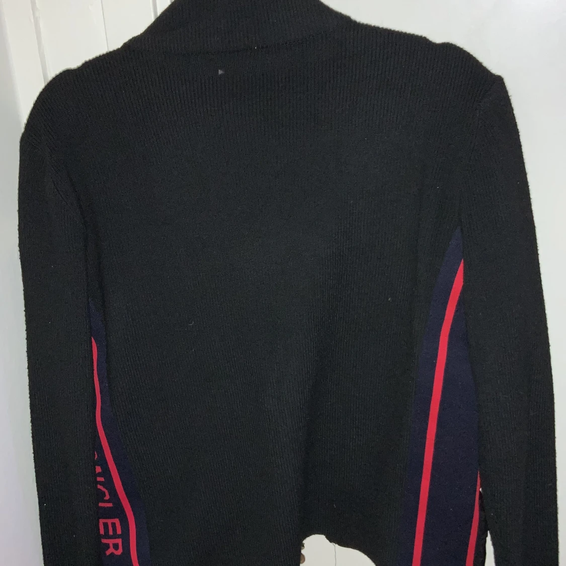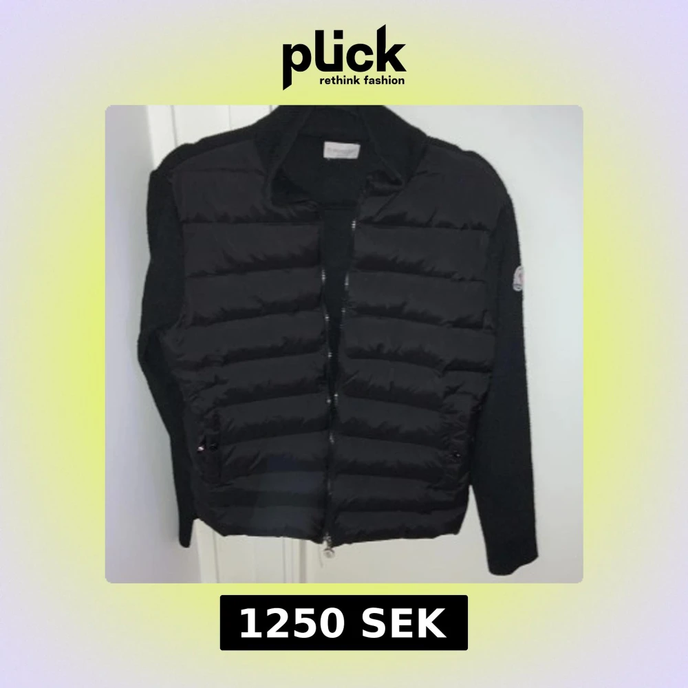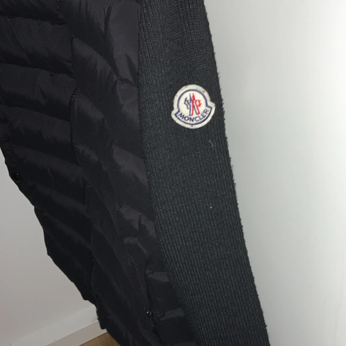 Snygg svart pufferjacka från Moncler med stickade ärmar och dragkedja framtill. Jackan har ett Moncler-märke på ärmen och röda detaljer på sidorna. Perfekt för kyligare dagar.