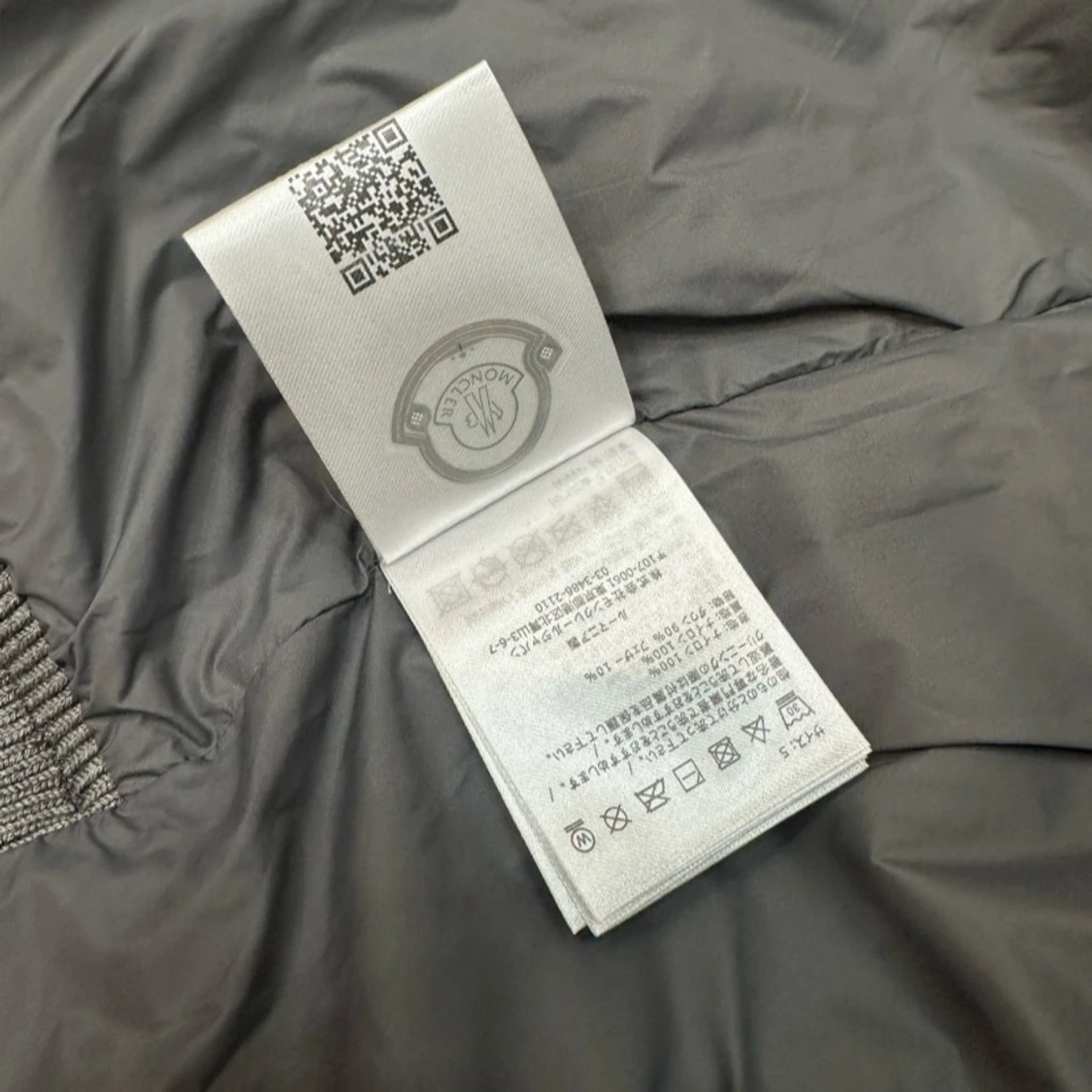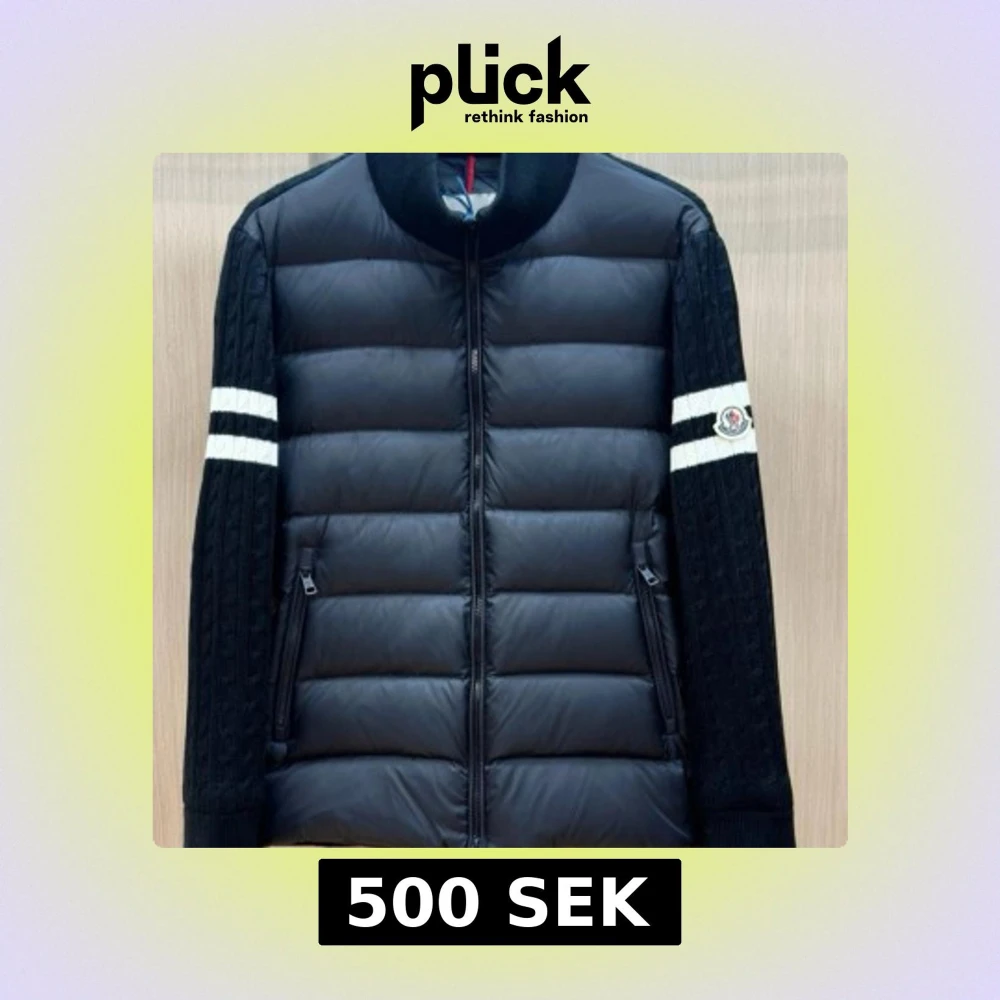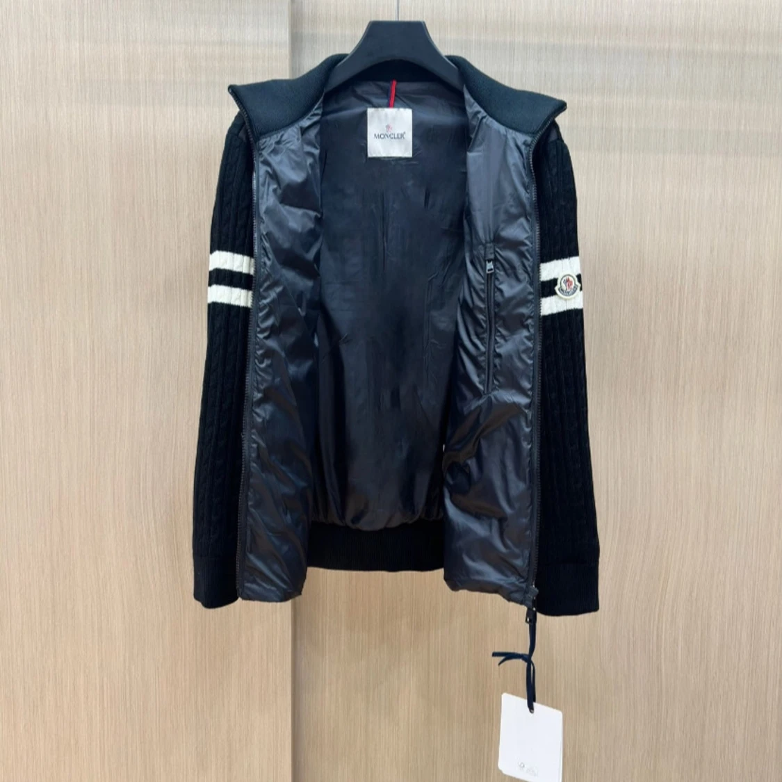 Snygg svart pufferjacka från Moncler med stickade ärmar och vita ränder. Jackan har dragkedja och en broderad logga på ärmen. Perfekt för kyliga dagar.